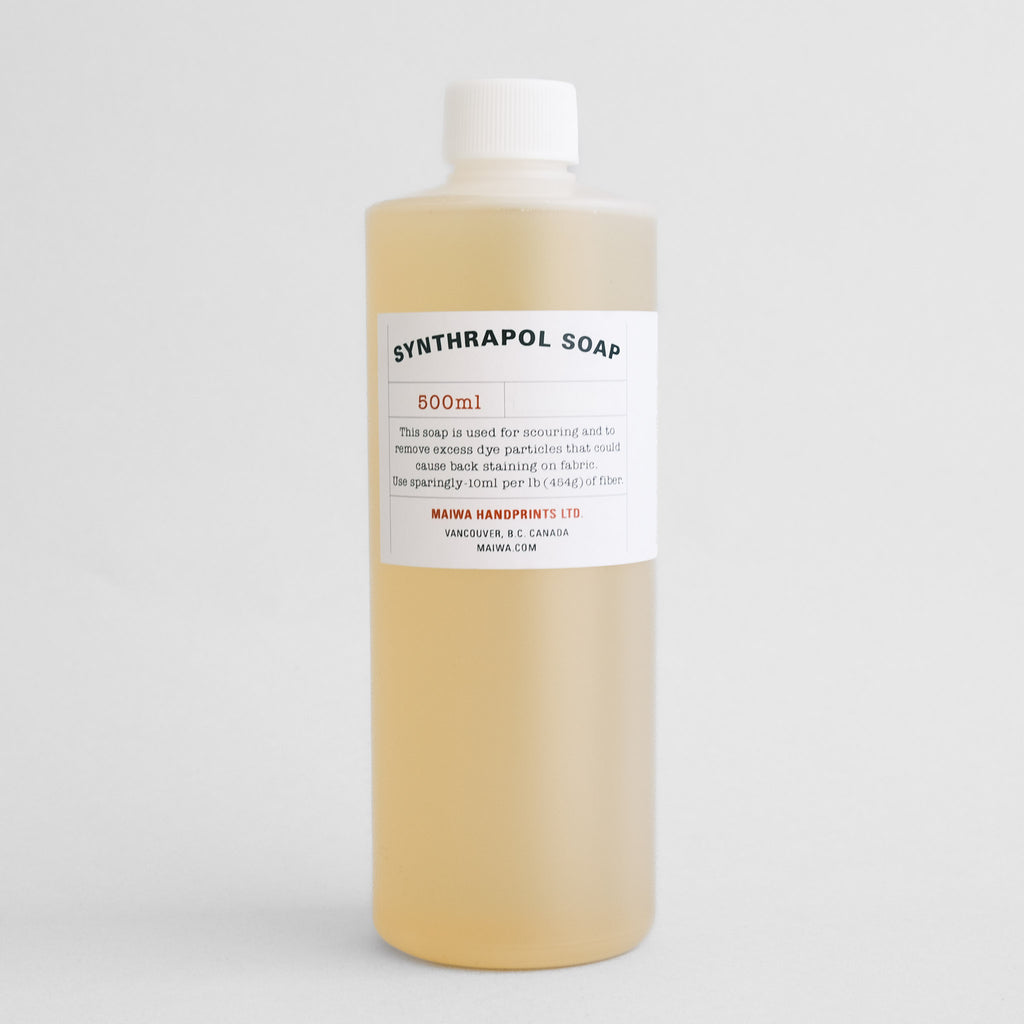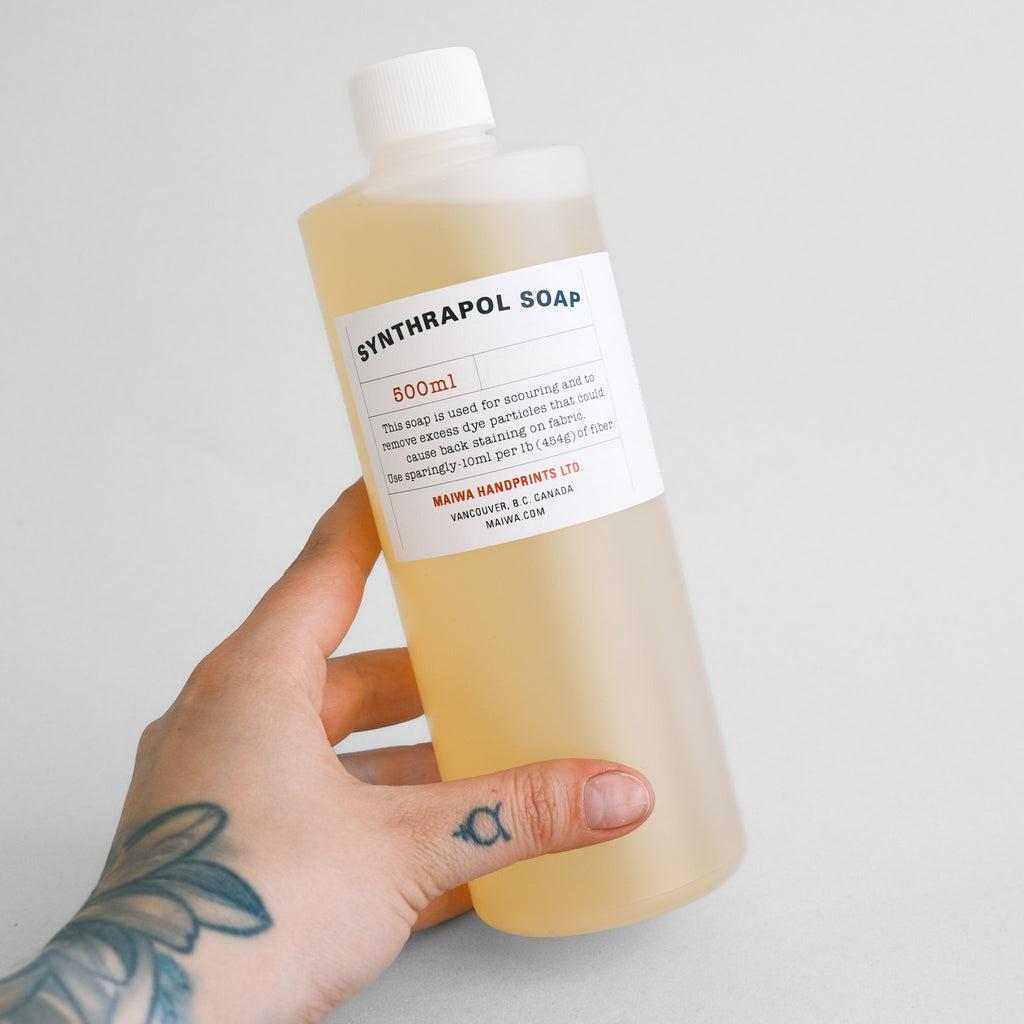 Synthrapol is a non-ionic a soap that is used for scouring (pre washing of your cloth to remove any barriers that may lead to uneven dyeing) and to remove excess dye and prevent it from redepositing on the fabric. This helps in achieving clearer, more consistent colours and prevents dye bleeding during the wash process.