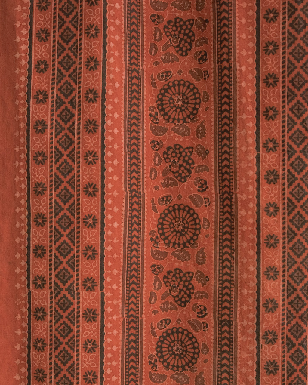 Ajrakh is a traditional style of block printing which uses hand-carved wooden blocks to print natural dyes on organic cotton. These Ajrakhs are made by a family that has been block printing for over nine generations - the Khatri family residing in the Kachchh desert of Gujarat, India.