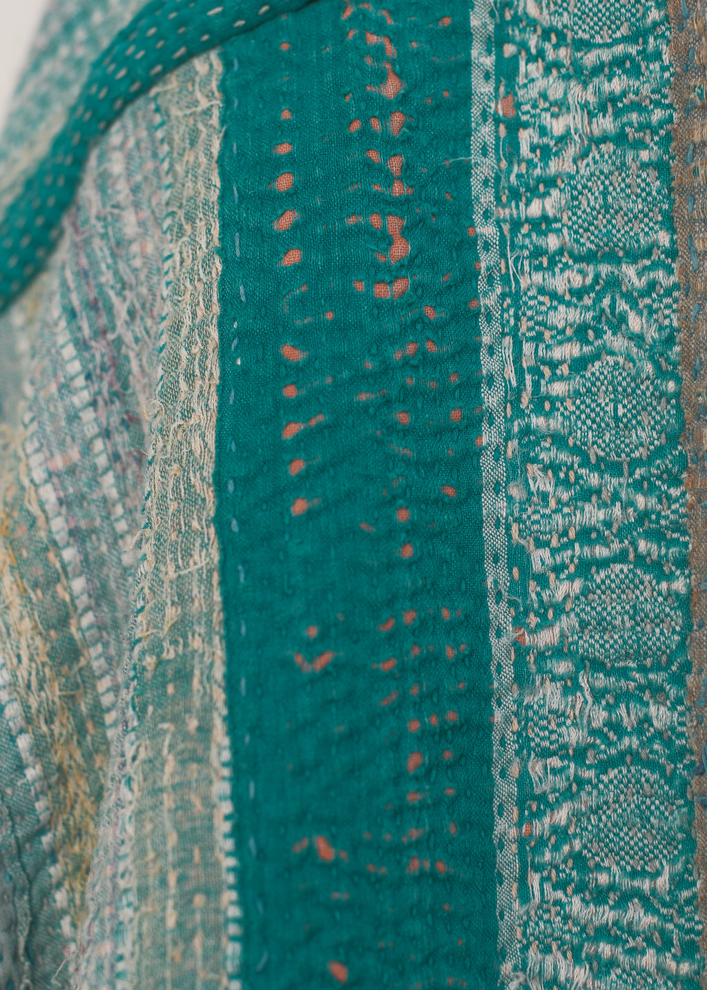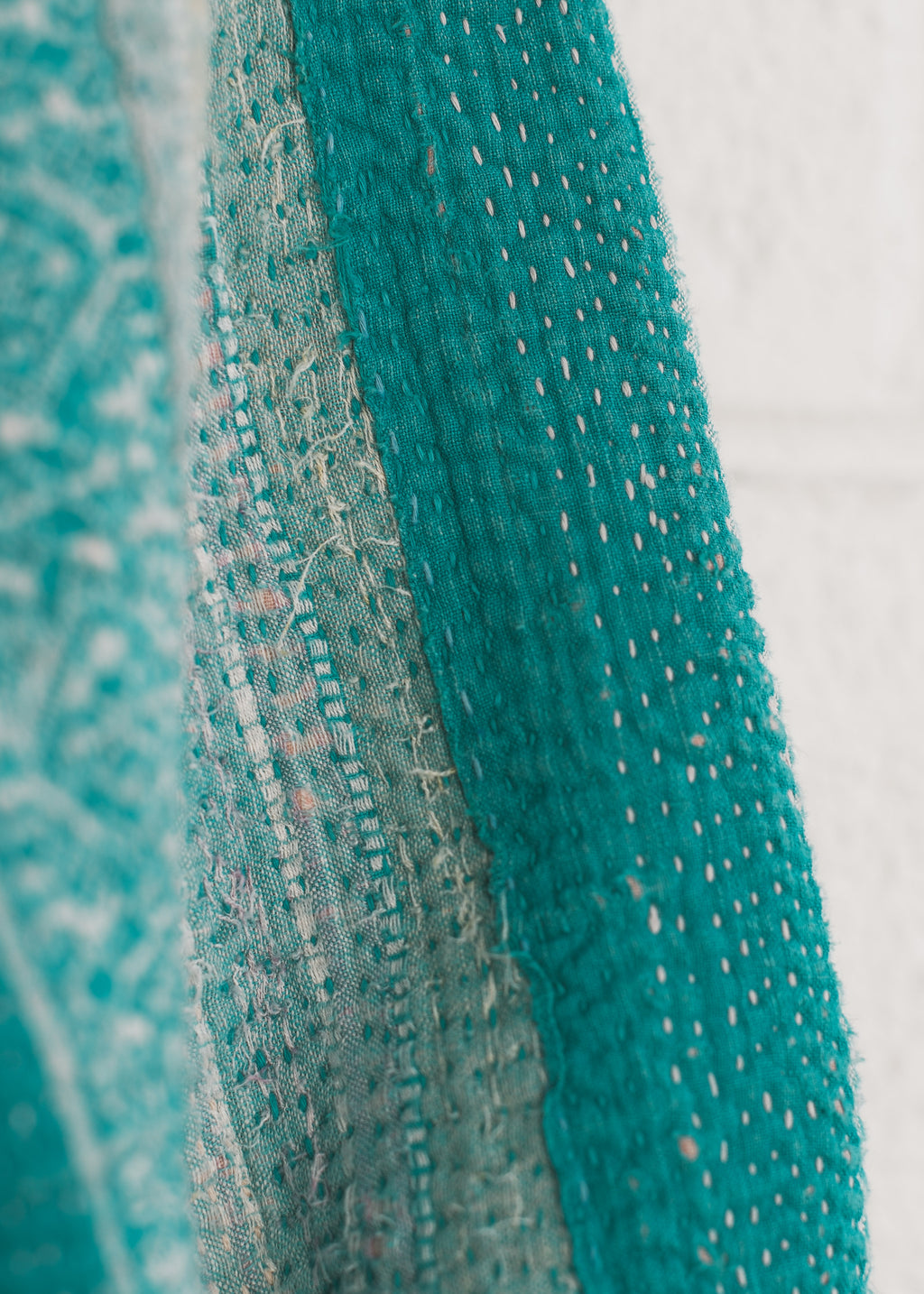 This piece is made from a beautiful kantha quilt. Favourite prints, saris, and beloved lengths of cloth are stitched together with plain and coloured threads. Every quilter has her own individual style.  We love the history and stories each one holds.