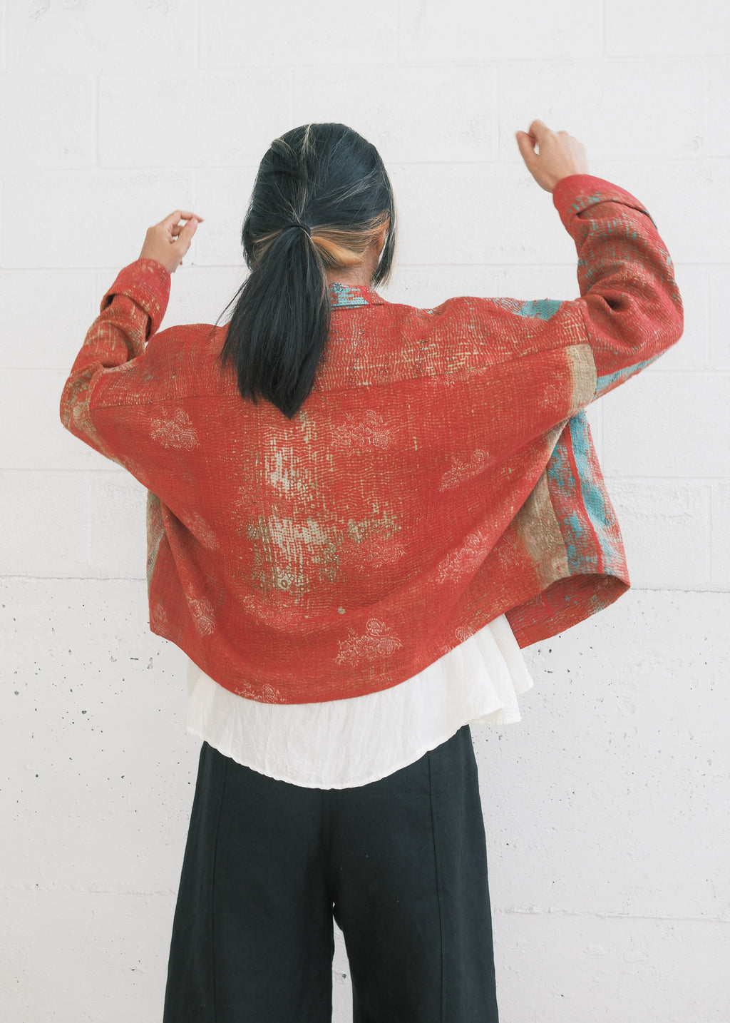 • Kantha stitching is done by hand and runs along the entire garment