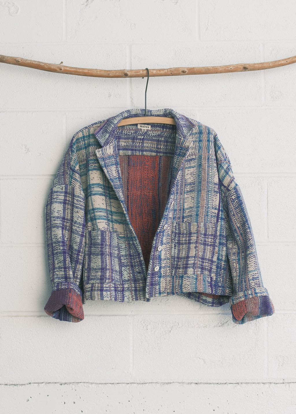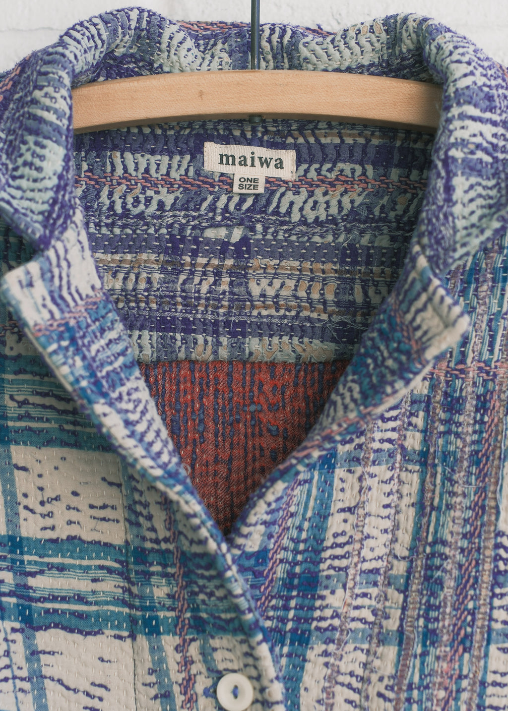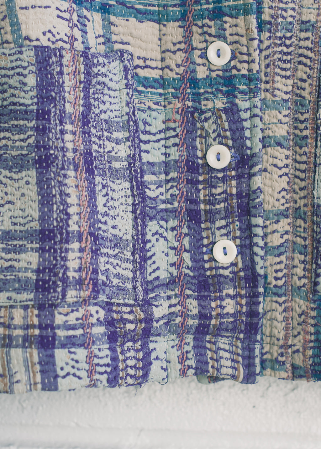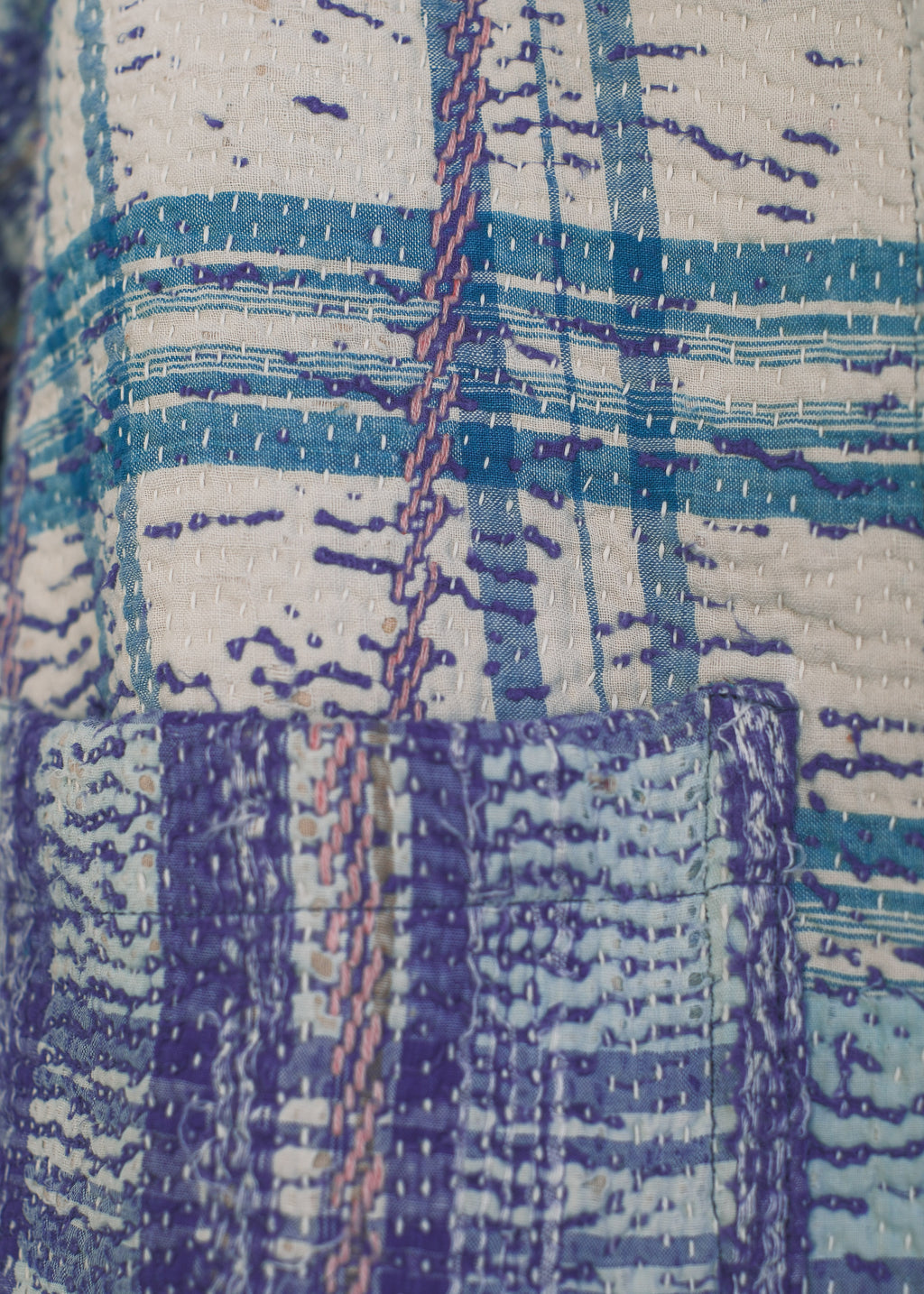 This piece is made from a beautiful kantha quilt. Favourite prints, saris, and beloved lengths of cloth are stitched together with plain and coloured threads. Every quilter has her own individual style.  We love the history and stories each one holds.