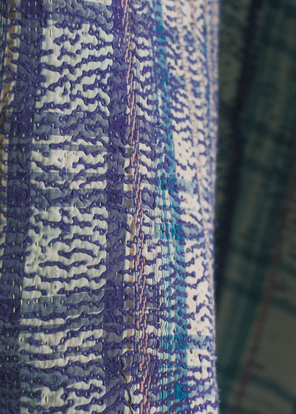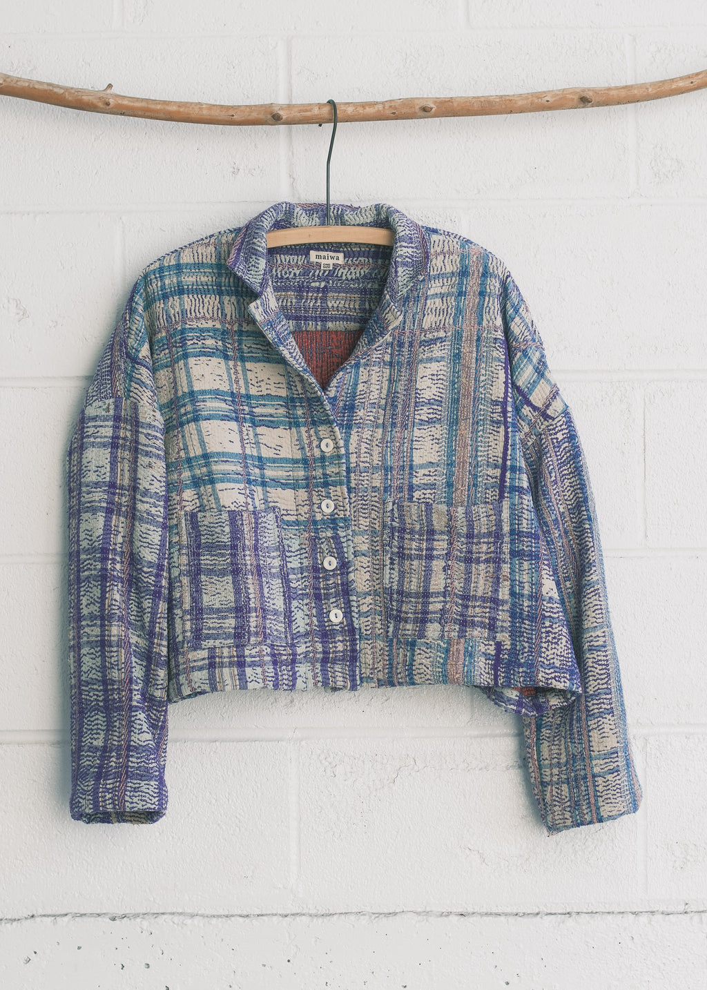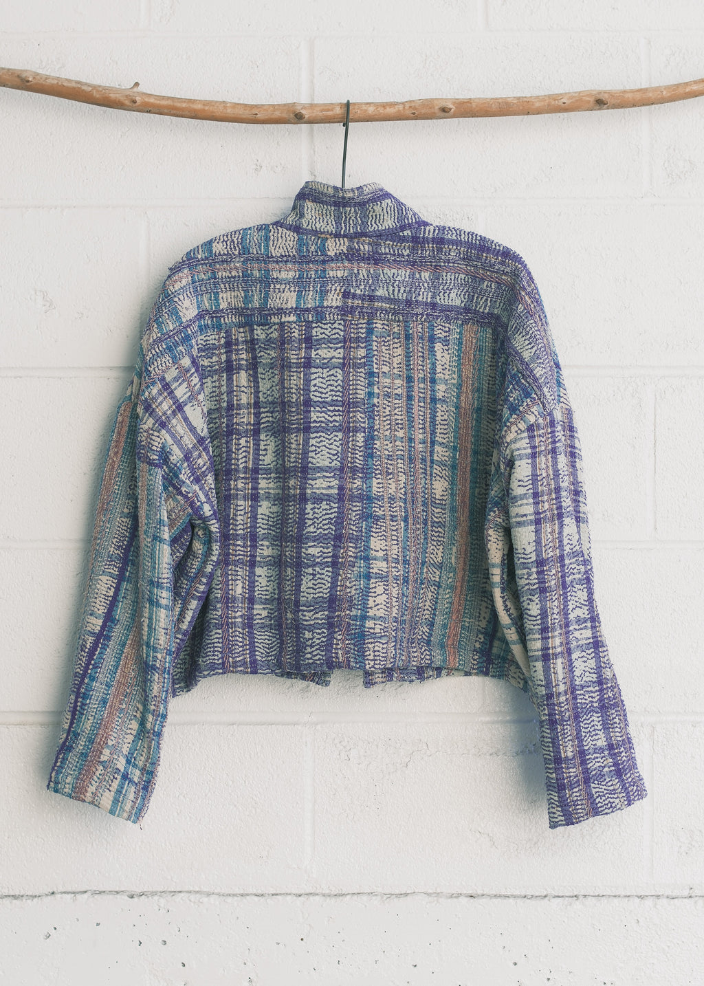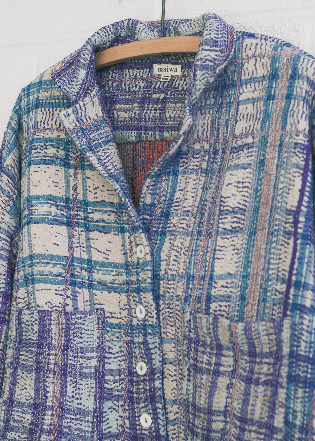 This piece is made from a beautiful kantha quilt. Favourite prints, saris, and beloved lengths of cloth are stitched together with plain and coloured threads. Every quilter has her own individual style.  We love the history and stories each one holds.