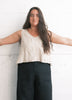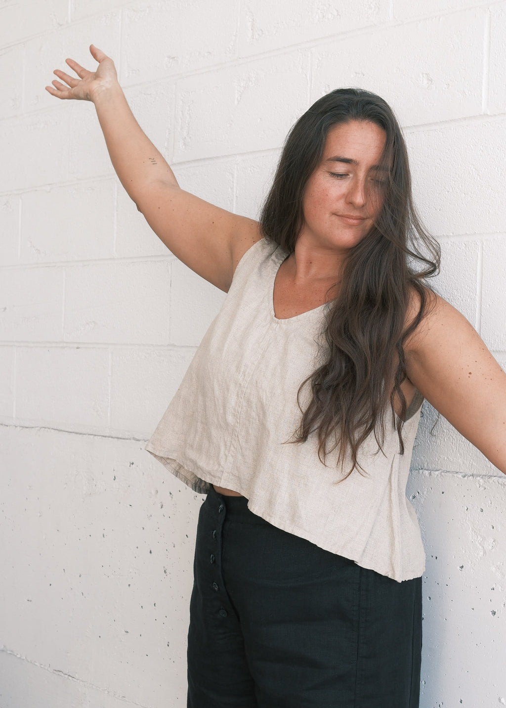 A very cute tank with a petal shape and a scooped neckline front and back. Featuring wide straps with generous arm holes and great drape. A style that is versatile for many different body types. Constructed from beautiful linen cloth that will just get better and better with age.