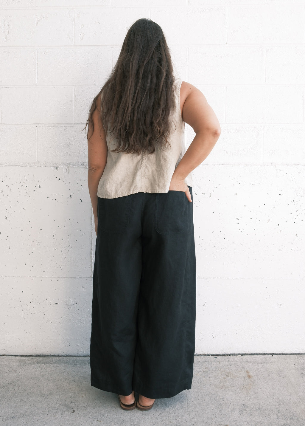 A very cute tank with a petal shape and a scooped neckline front and back. Featuring wide straps with generous arm holes and great drape. A style that is versatile for many different body types. Constructed from beautiful linen cloth that will just get better and better with age.