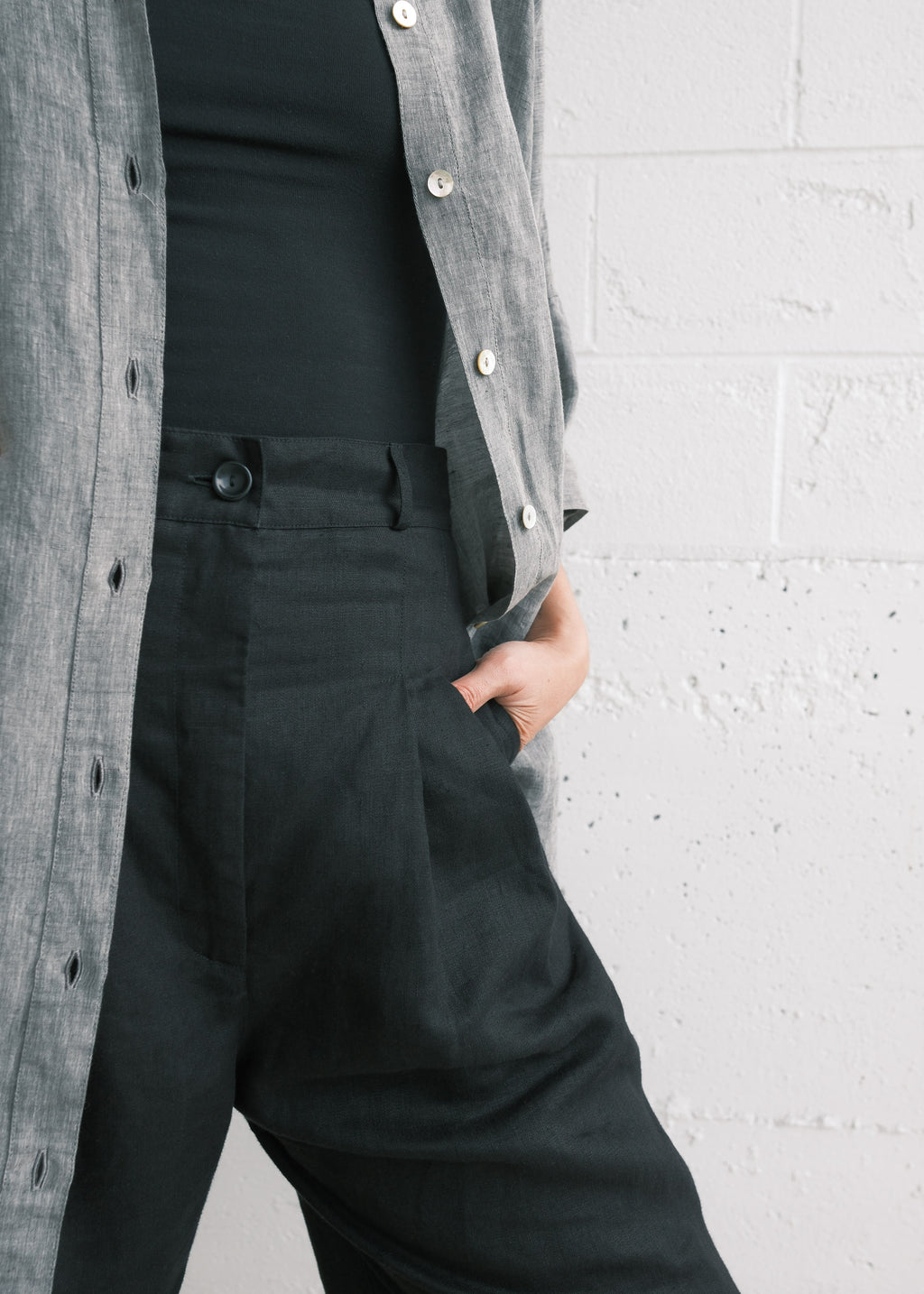 One of our more fitted pants - high-waisted, wide leg trouser sewn out of our buttery linen twill. Featuring an elegant pleat detail along the front, zip and button closure, belt loops, and side pockets. Looks great belted!