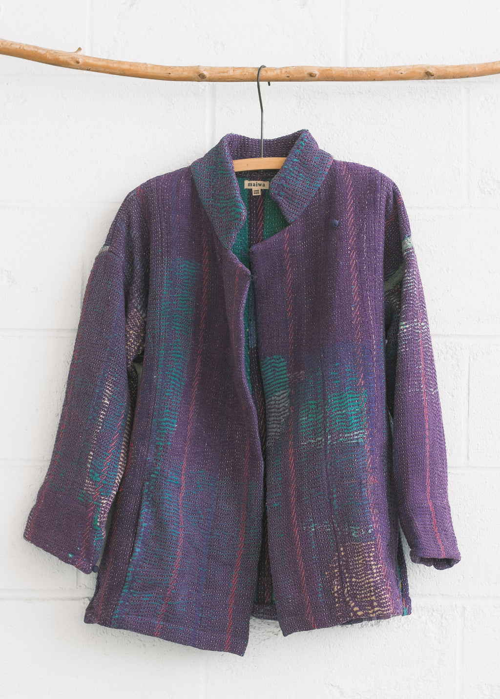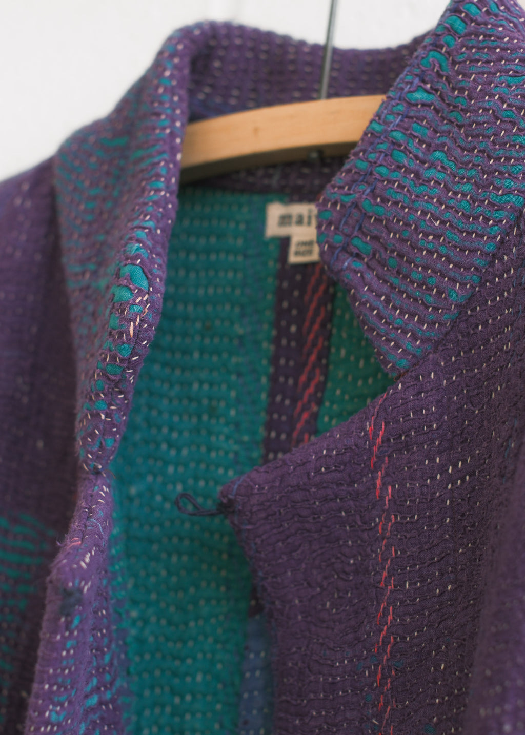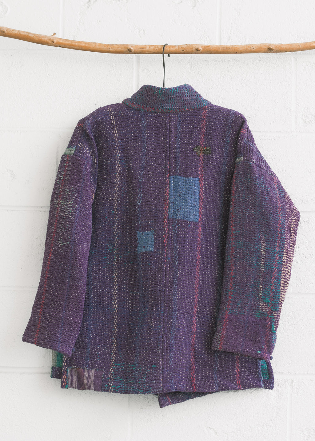 This jacket is made from a beautiful kantha quilt. Favourite prints, saris, and beloved lengths of cloth are stitched together with plain and coloured threads. Every quilter has her own individual style.  We love the history and stories each one holds.