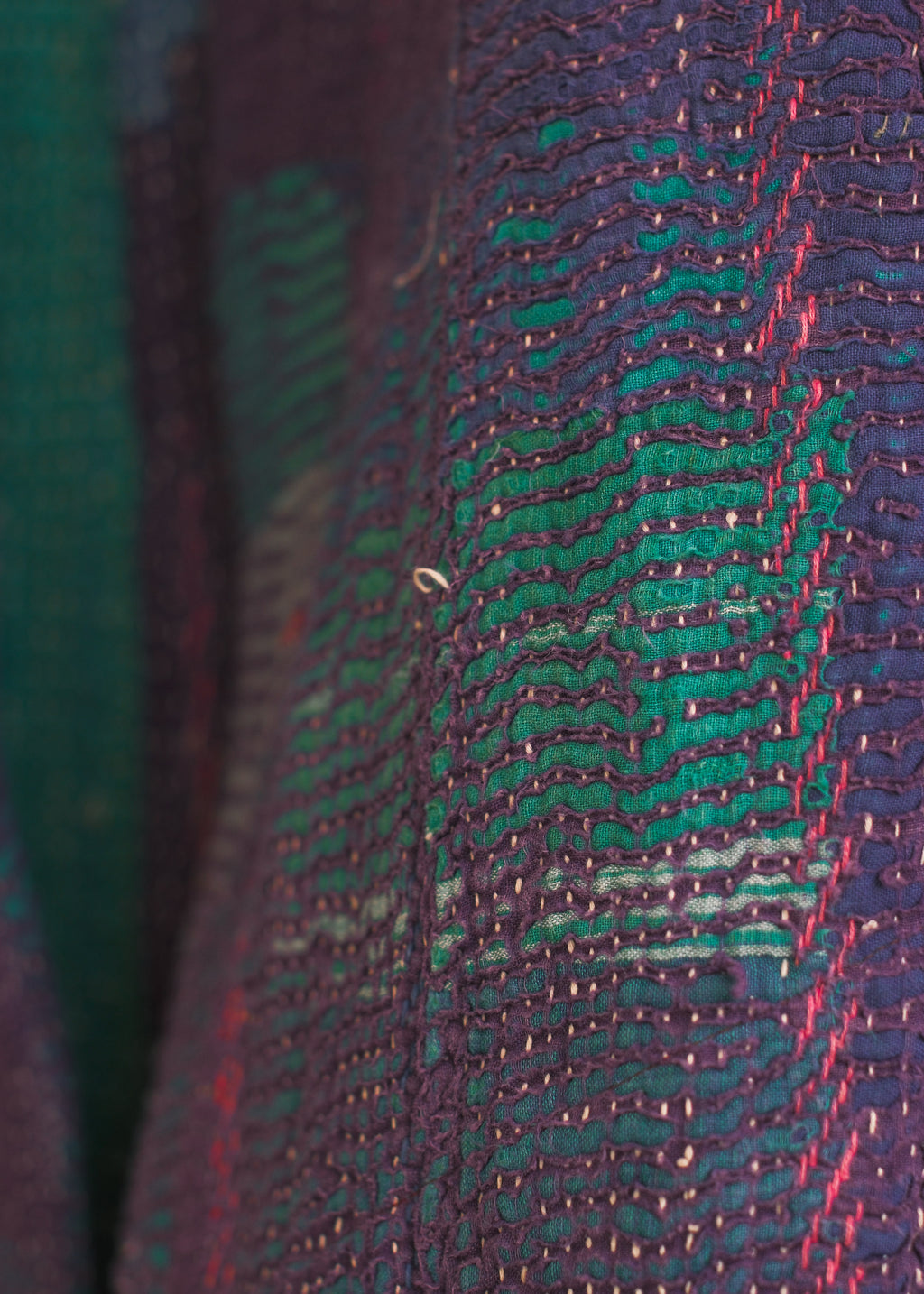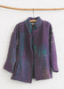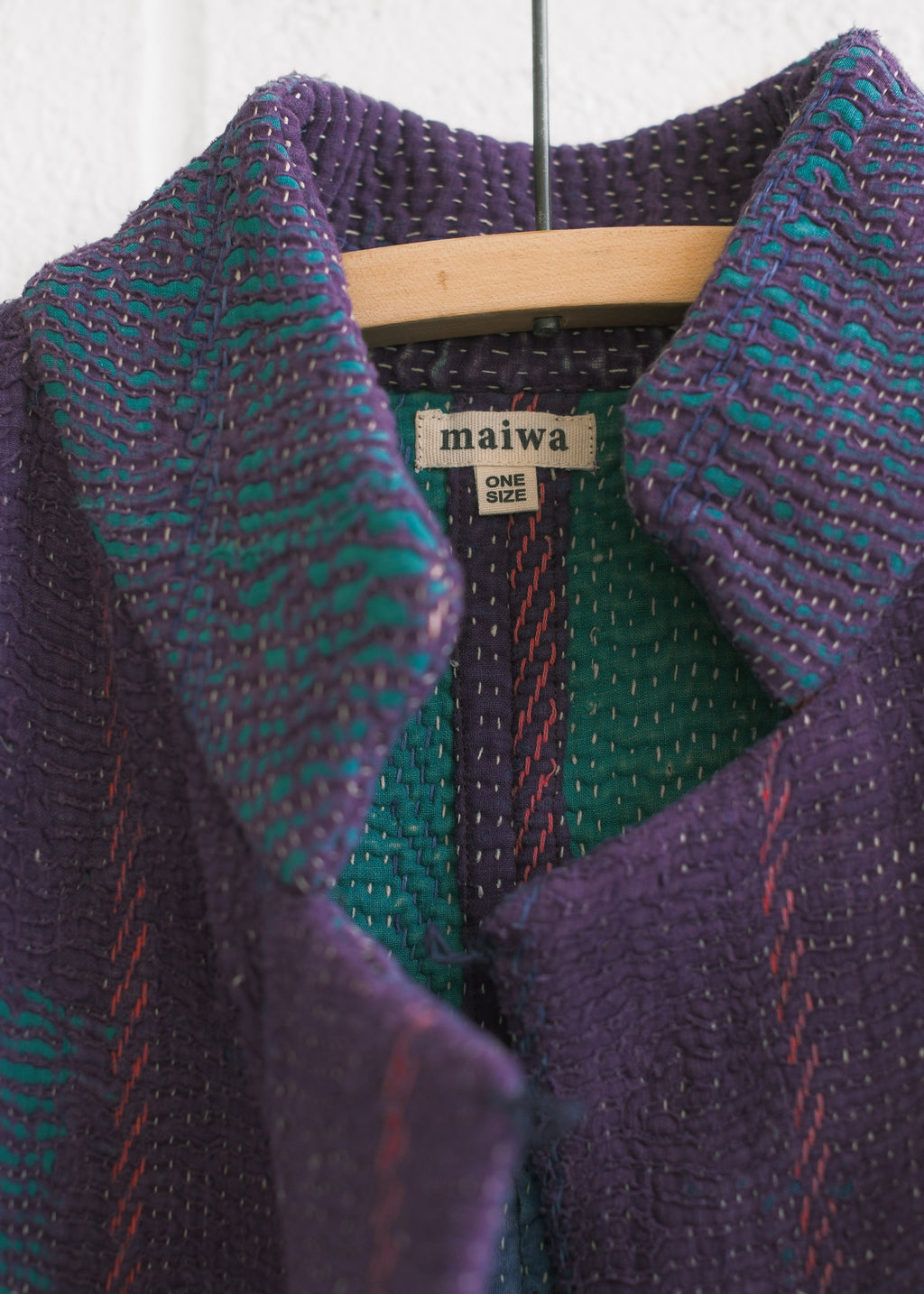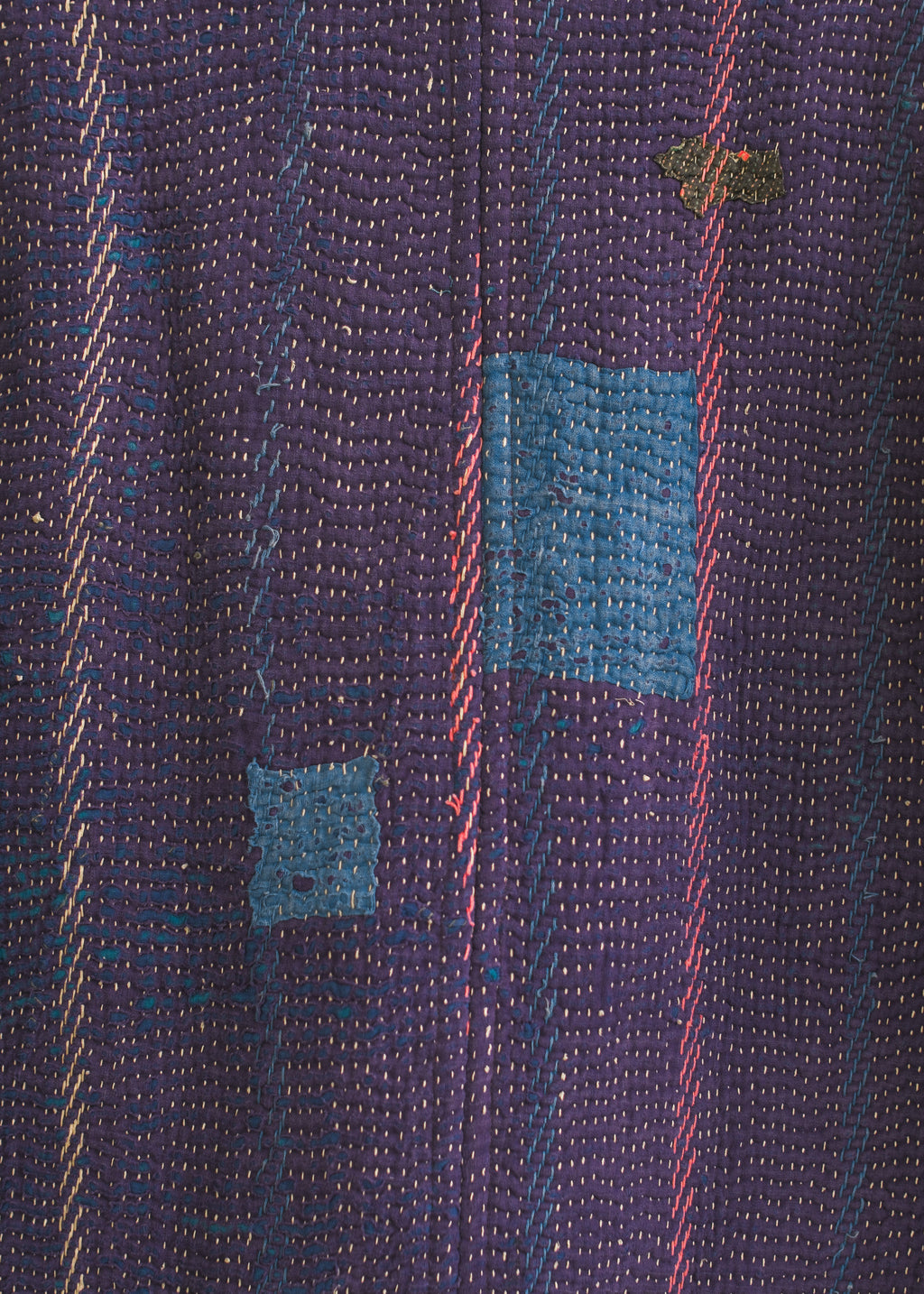 This jacket is made from a beautiful kantha quilt. Favourite prints, saris, and beloved lengths of cloth are stitched together with plain and coloured threads. Every quilter has her own individual style.  We love the history and stories each one holds.