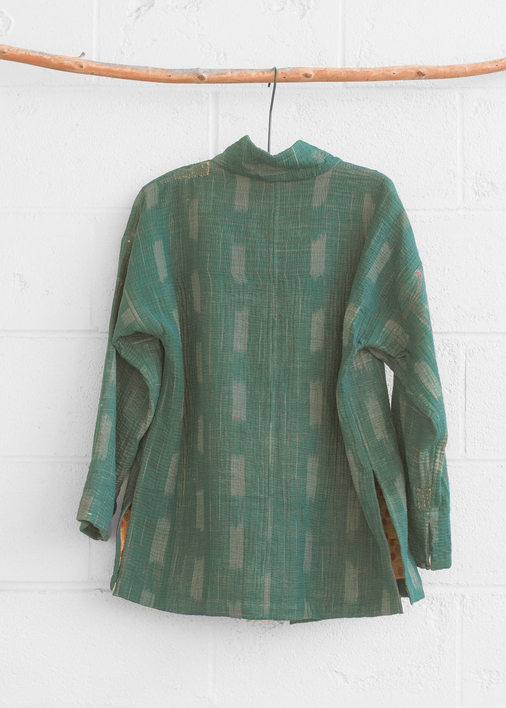 This jacket is made from a beautiful kantha quilt. Favourite prints, saris, and beloved lengths of cloth are stitched together with plain and coloured threads. Every quilter has her own individual style.  We love the history and stories each one holds.