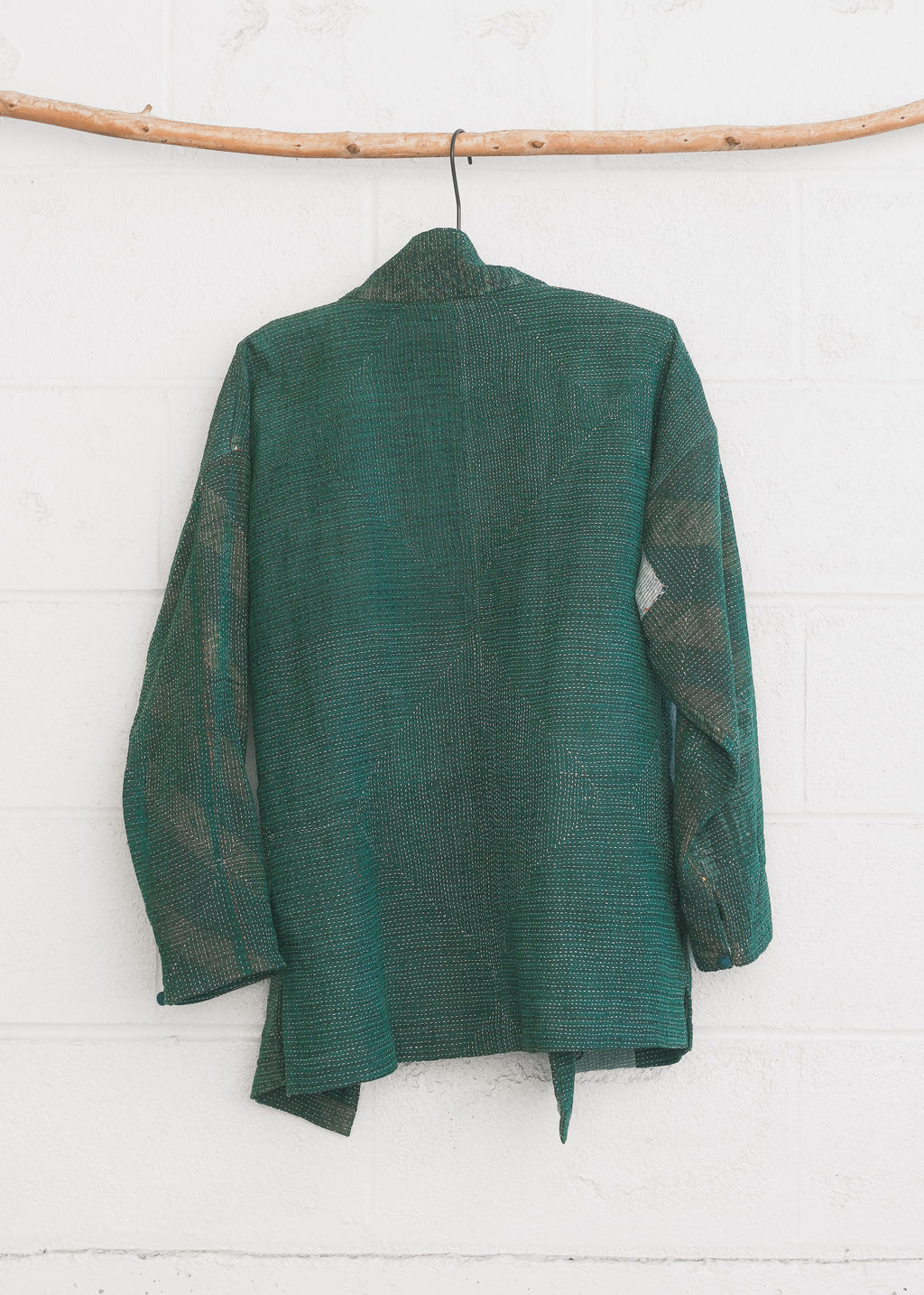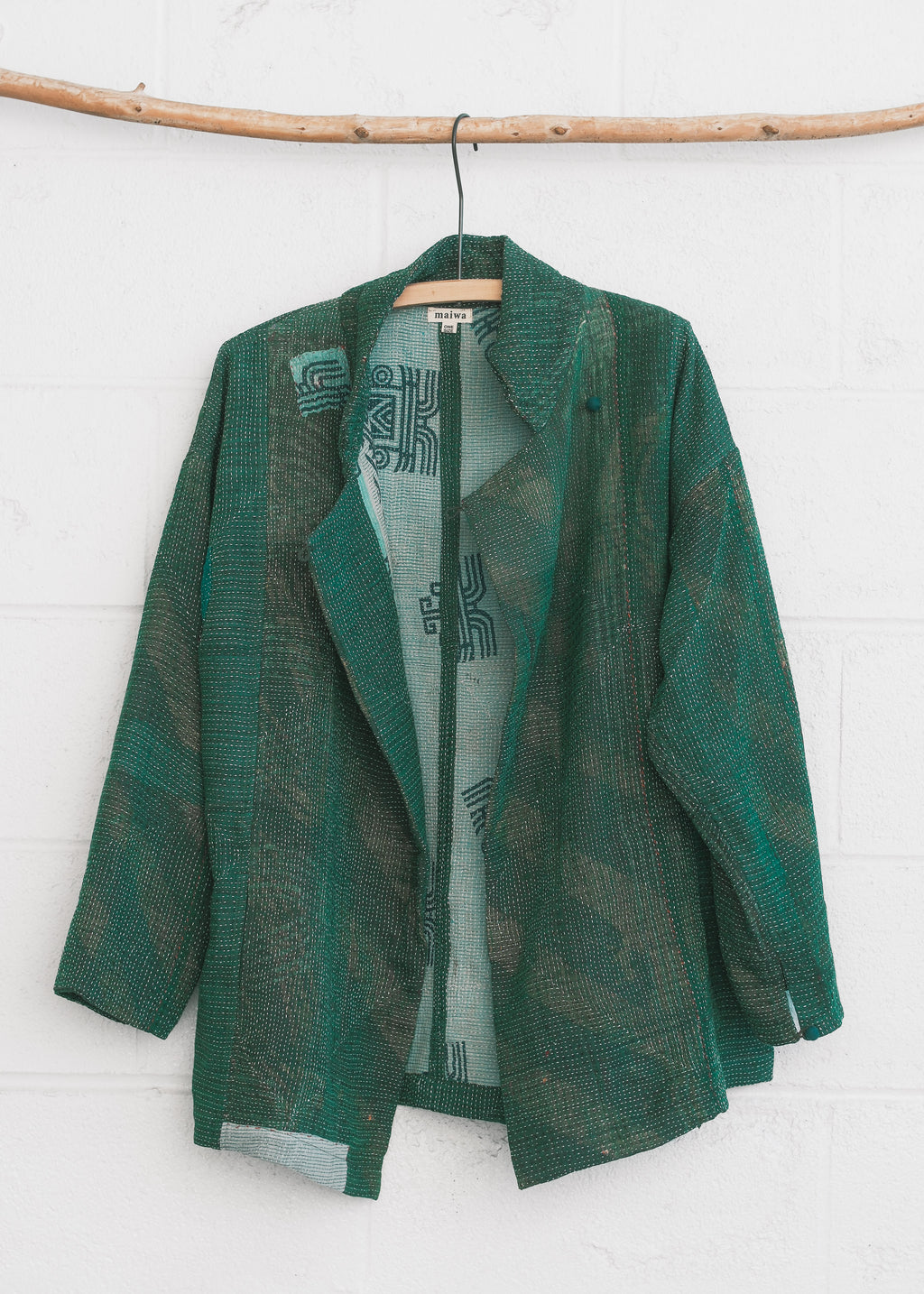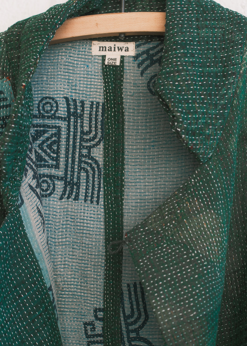 This jacket is made from a beautiful kantha quilt. Favourite prints, saris, and beloved lengths of cloth are stitched together with plain and coloured threads. Every quilter has her own individual style.  We love the history and stories each one holds.
