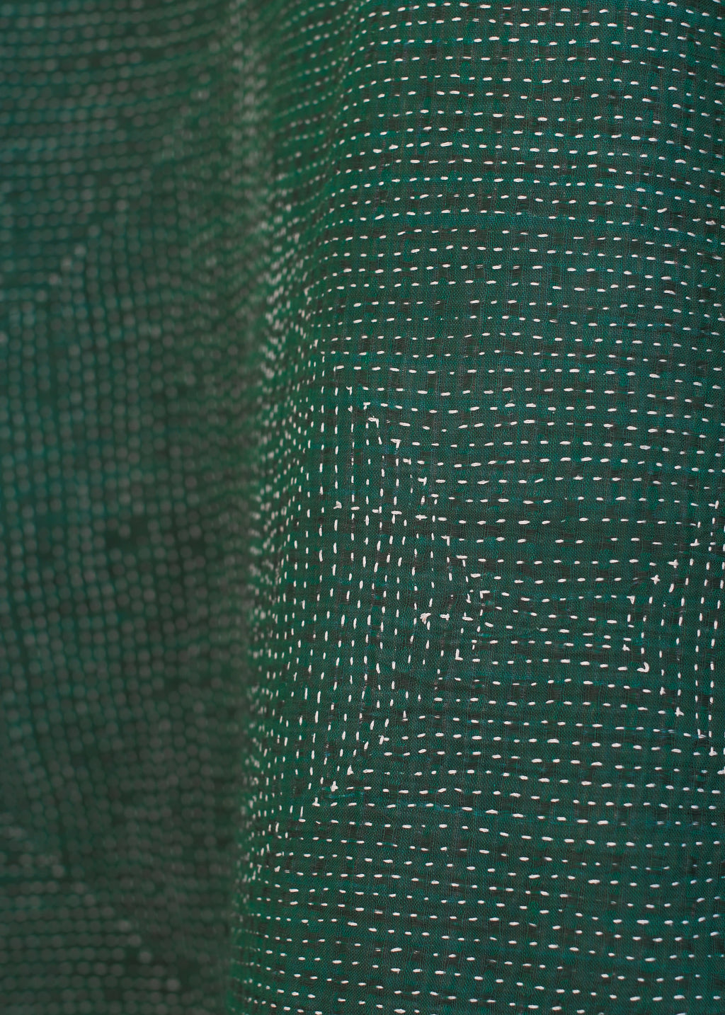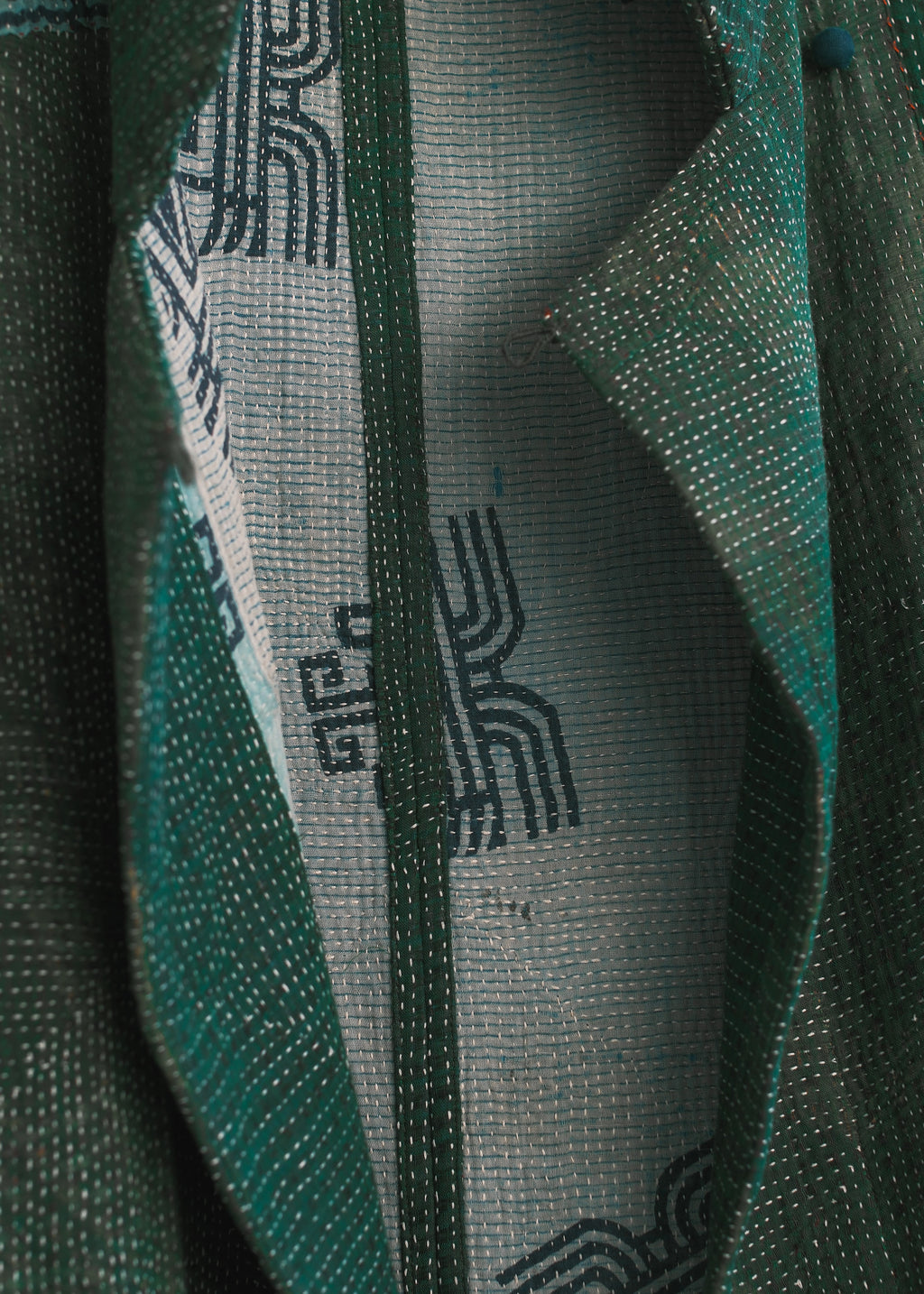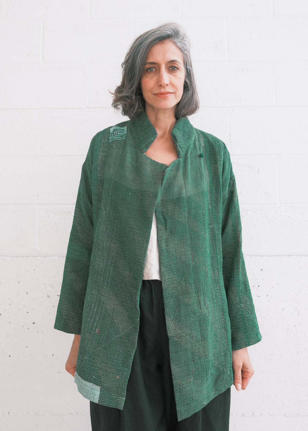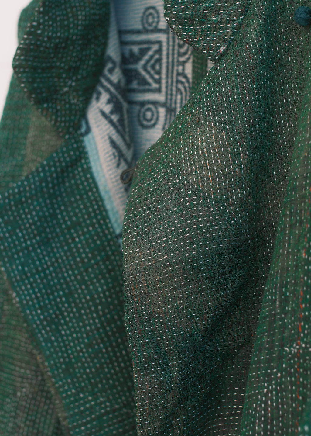 This jacket is made from a beautiful kantha quilt. Favourite prints, saris, and beloved lengths of cloth are stitched together with plain and coloured threads. Every quilter has her own individual style.  We love the history and stories each one holds.