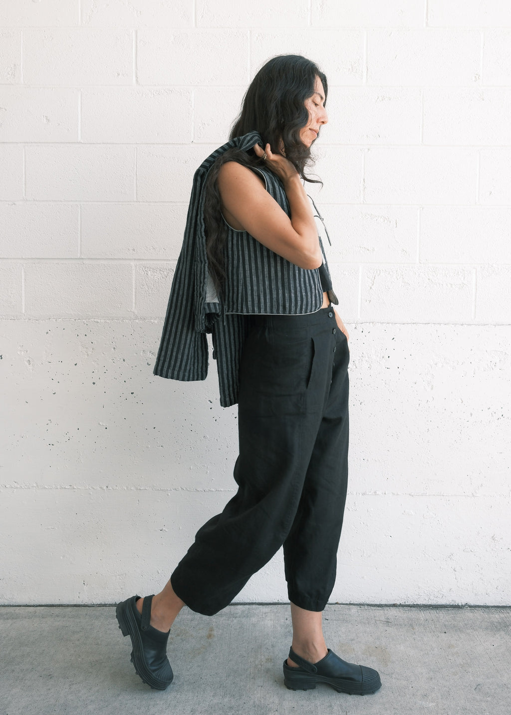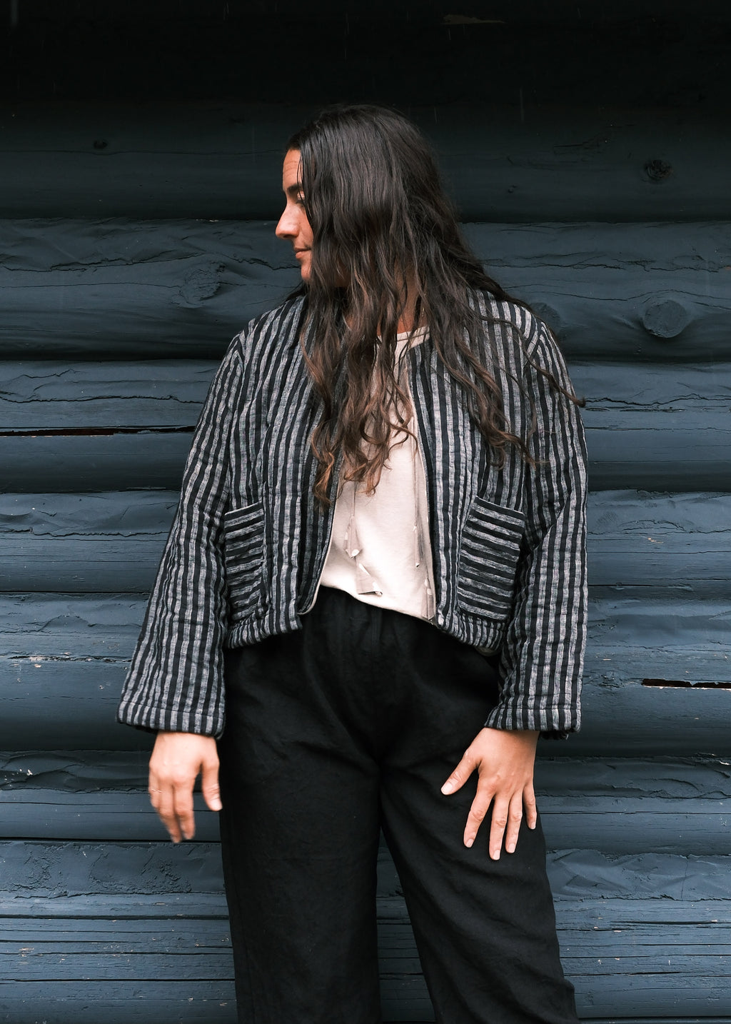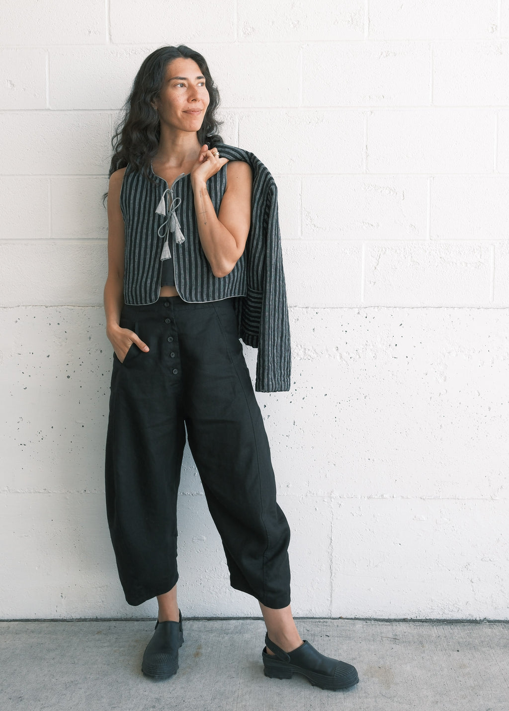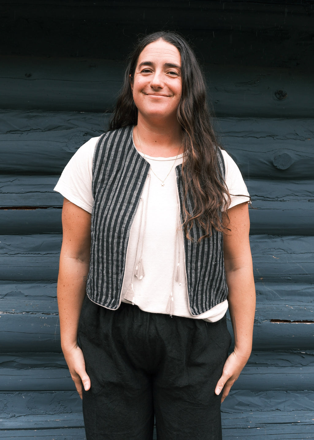 Quilted Juniper Vest - Handwoven Linen - Black Stripe