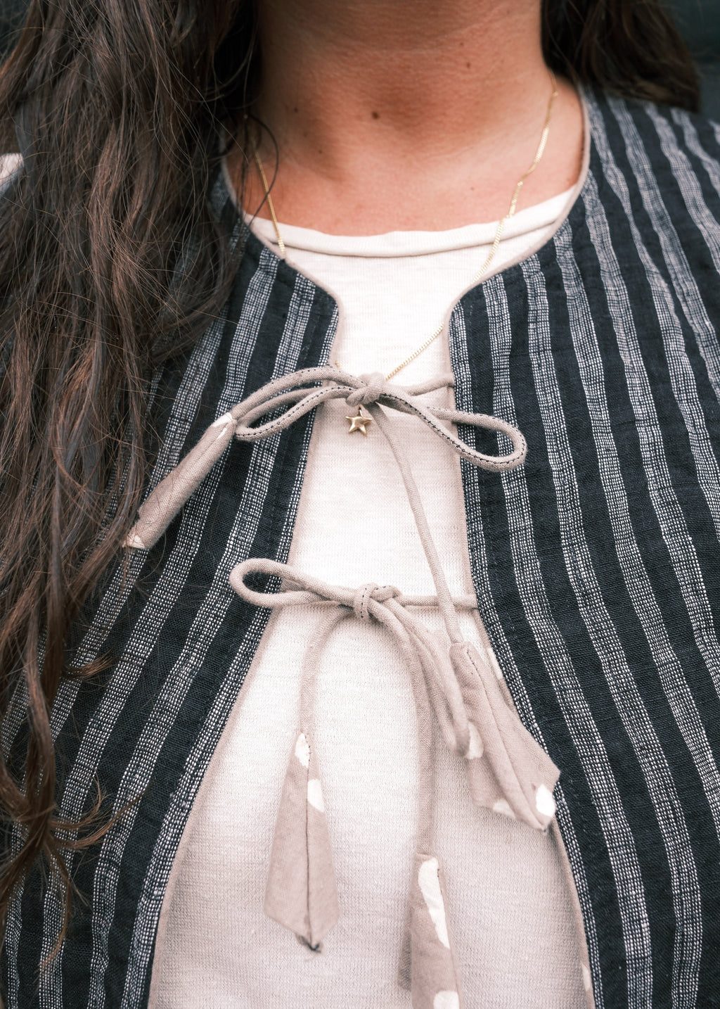 A sweet quilted vest! Made with two layers of handwoven linen and a layer of warm cotton batting in the middle. Boxy, with ties at the front, and piping along the edges. This piece works great layered or on its own as a staple piece.