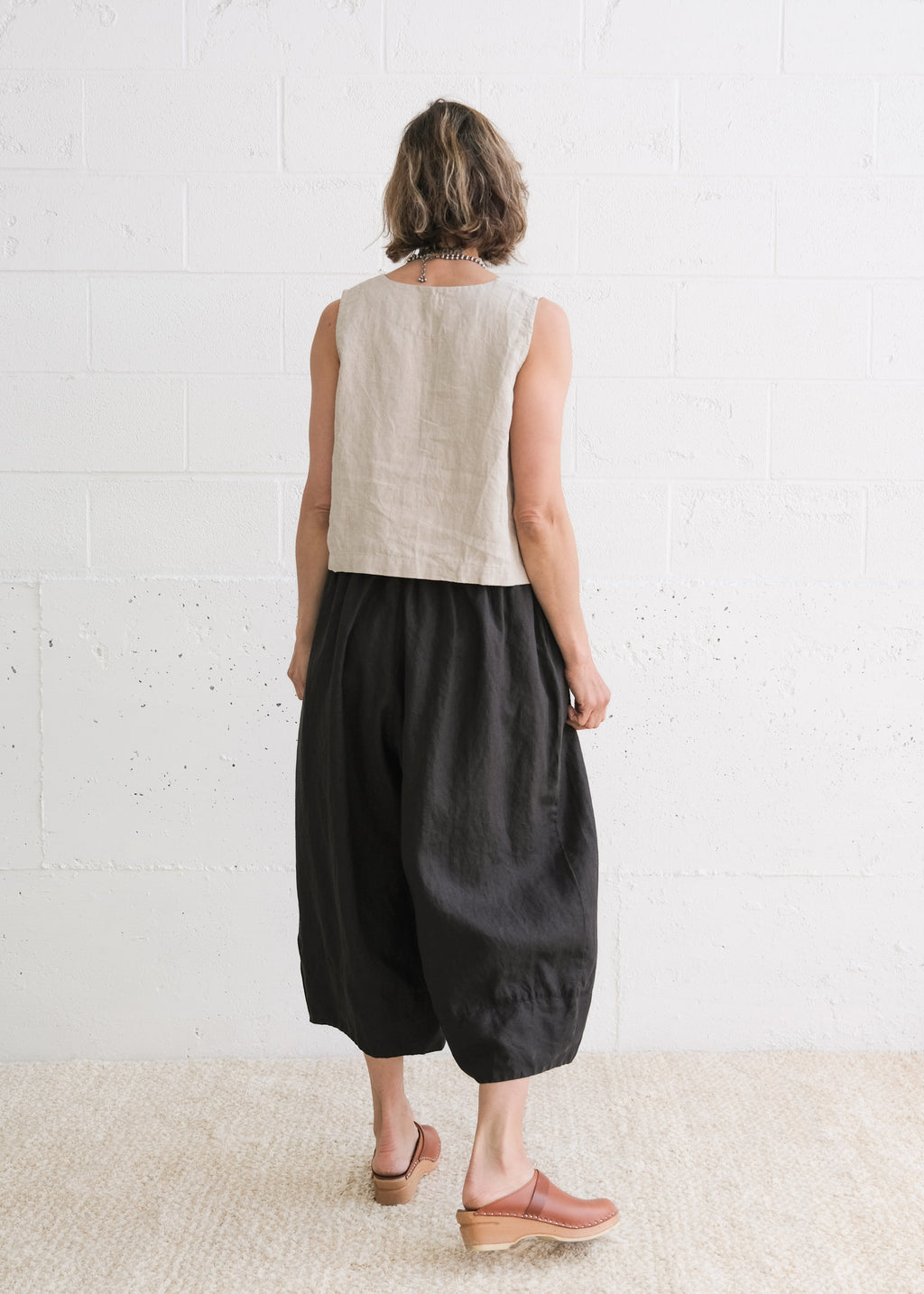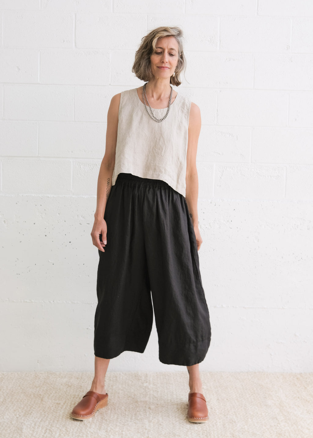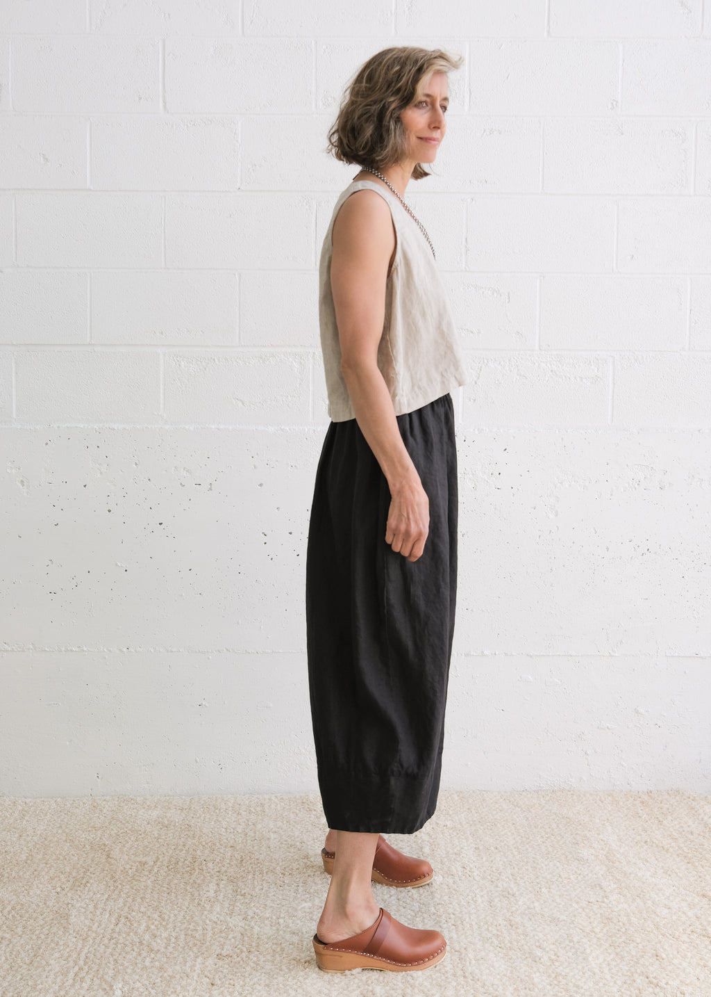 An indisputably comfortable wide leg pant that pulls in at the bottom to meet a curved architectural hem. Comfortable statement elastic sits high on the waist. Perfect pant to move in.