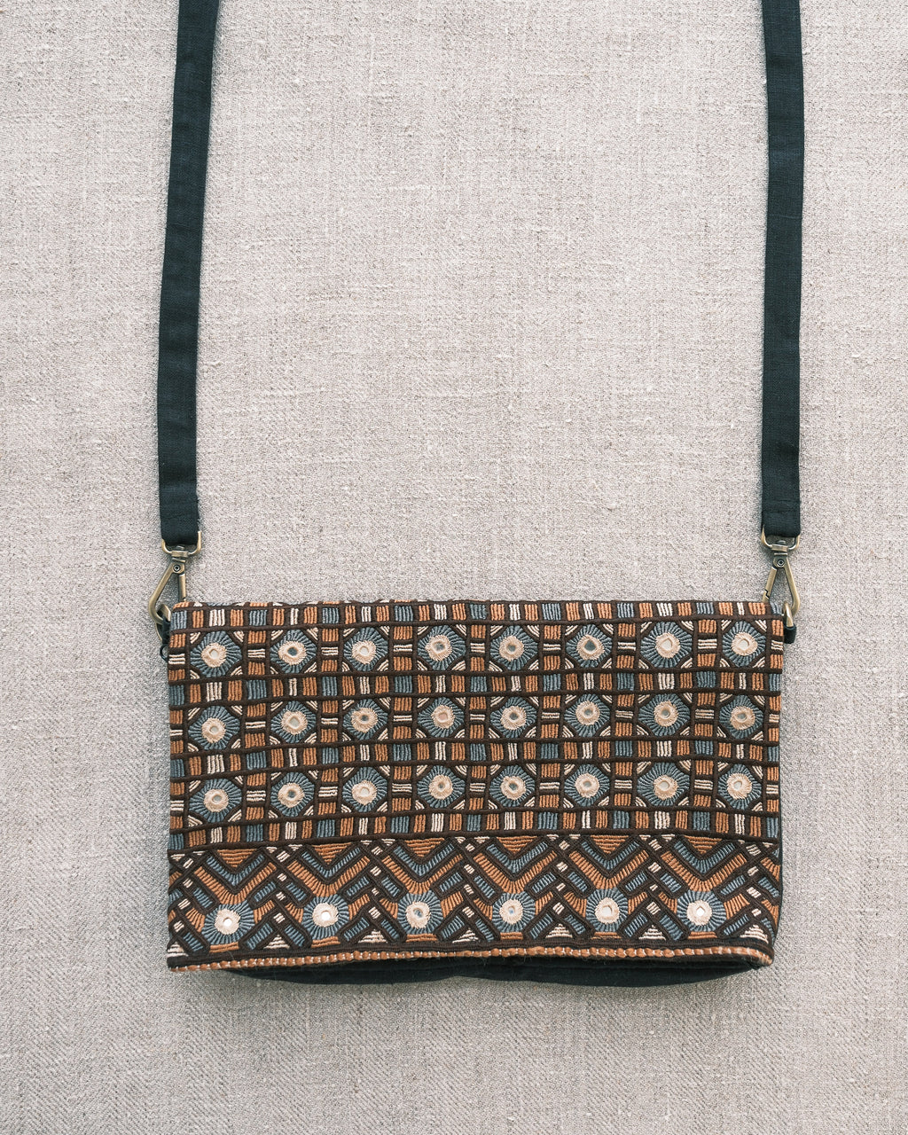 Features: Traditional embroidery using small mirrors and motifs on a linen bag which folds in half, encasing the whole piece in beautiful embroidery. Featuring a zipper closure, front magnetic snap, and inner zip pocket. The linen shoulder strap is detachable, turning the bag into a large clutch.