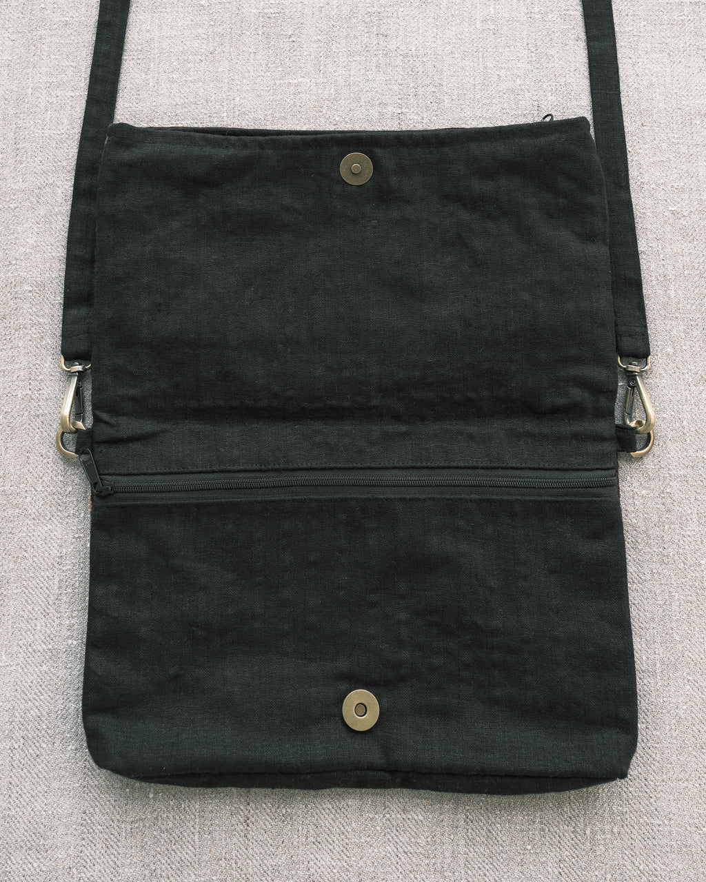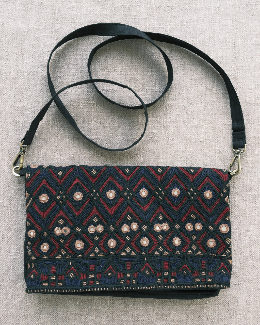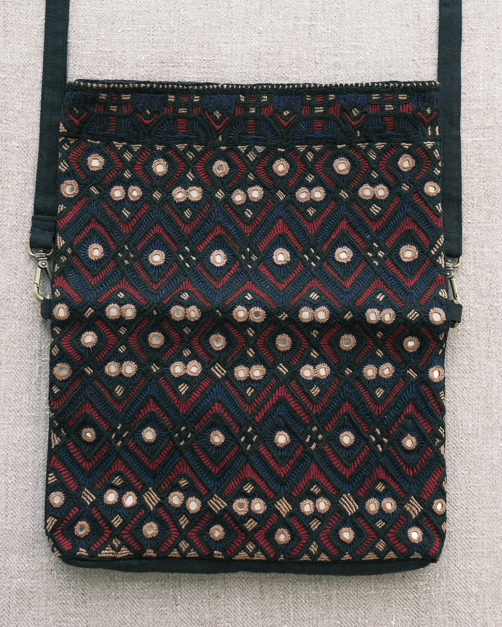 Features: Traditional embroidery using small mirrors and motifs on a linen bag which folds in half, encasing the whole piece in beautiful embroidery. Featuring a zipper closure, front magnetic snap, and inner zip pocket. The linen shoulder strap is detachable, turning the bag into a large clutch.