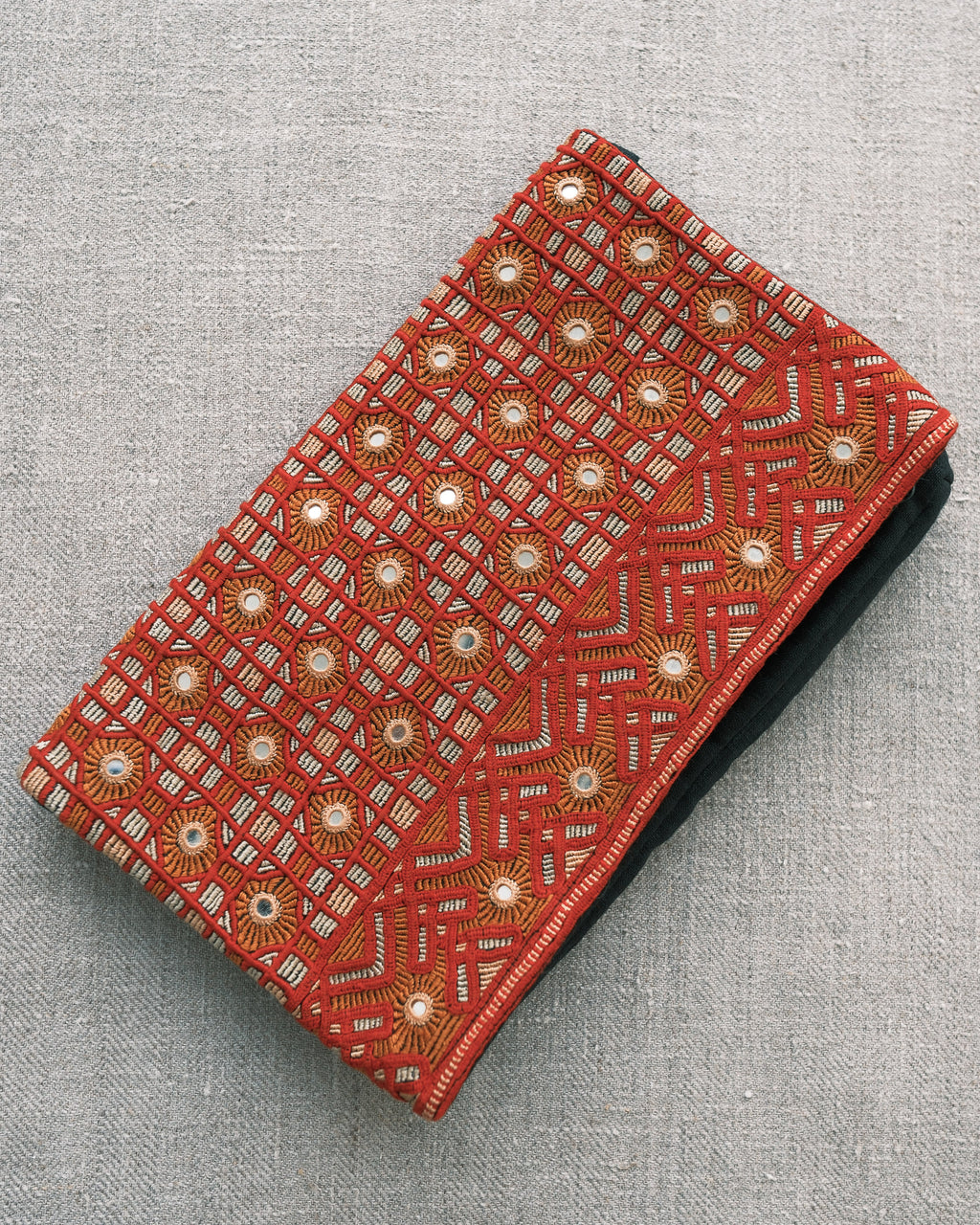 Features: Traditional embroidery using small mirrors and motifs on a linen bag which folds in half, encasing the whole piece in beautiful embroidery. Featuring a zipper closure, front magnetic snap, and inner zip pocket. The linen shoulder strap is detachable, turning the bag into a large clutch.