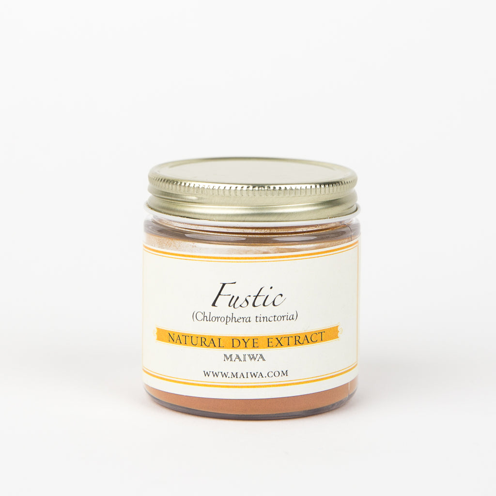 Fustic Extract - An extract prepared from the heartwood of a tree from the Mulberry family, Chlorophora tinctoria. Fustic produces a range of colours from daffodil yellow to deep gold to orange. When used as an underdye with indigo Fustic yields forest greens and teals. Fustic has a high light and washfastness and exposure to strong sunlight may actually darken colours.