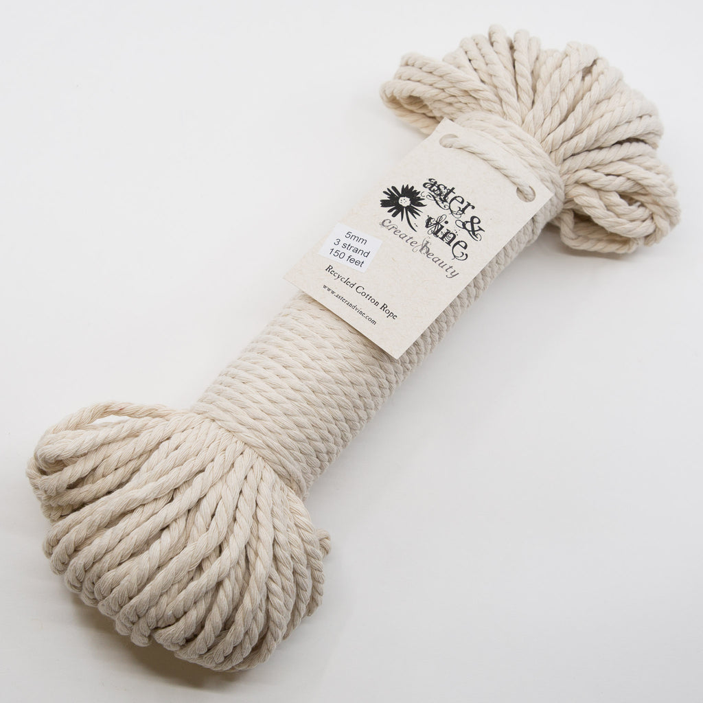 Aster & Vine's 5mm 3 strand rope is the perfect rope for macramé whether you are a beginner or an expert. Soft to the touch it holds tight and will give your finished product a nice wavy fray at the ends when complete. Length is 150 feet (45 meters).
