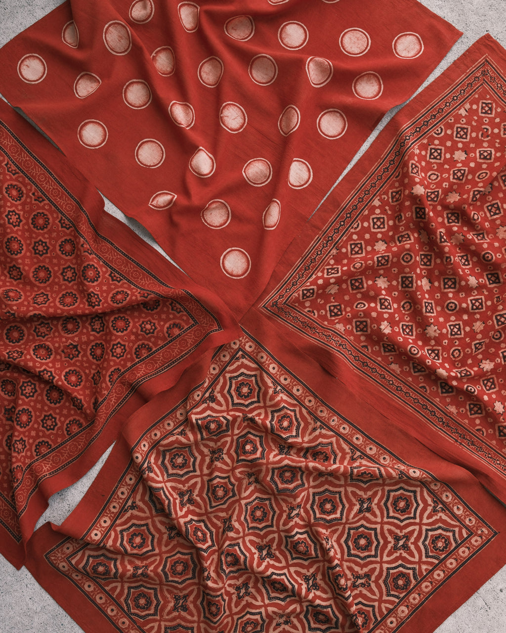 A bundle of 4 Ajrakh block printed bandanas - Geometrics, Madder Kaleidoscope, Madder Sun and Madder Bold.
