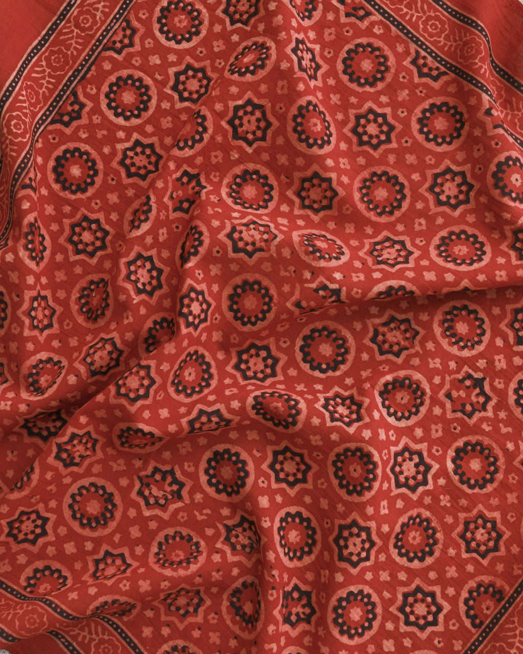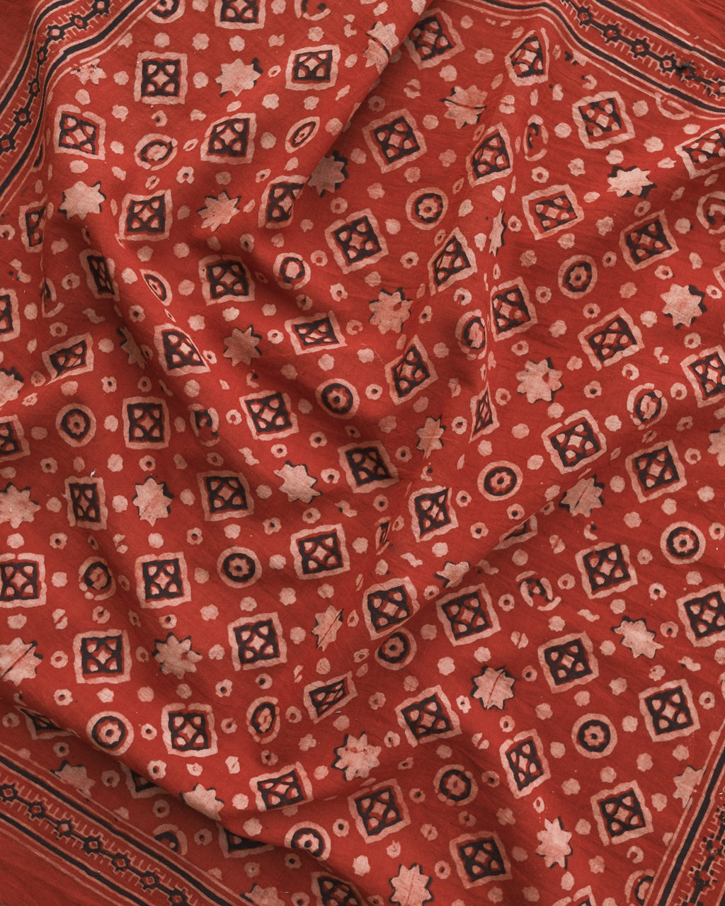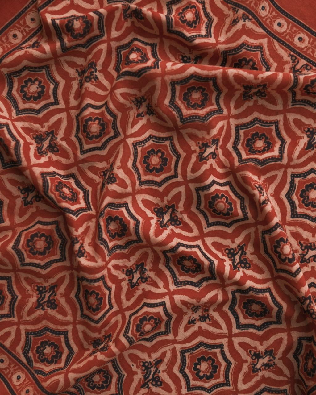 Ajrakh is a traditional style of block printing which uses hand-carved wooden blocks to print and resist natural dyes on organic cotton. These Ajrakhs are made by the Khatri family residing in the Kachchh desert of Gujarat, India - a family that have been block printing for over nine generations.