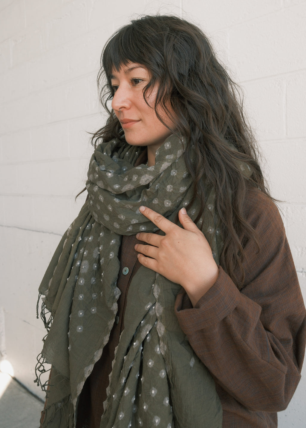 Each dot is the result of creating a tiny peak in the cloth and then tightly wrapping thread around the peak to resist the dye. Artisans work with precision as they slowly pattern the entire cloth - a lengthy process with an exquisite outcome. In Japan, this type of shaped resist is known as shibori. In the West small tie-and-dye pieces were widely traded and became known as “bandanas” - after the term bandhani.