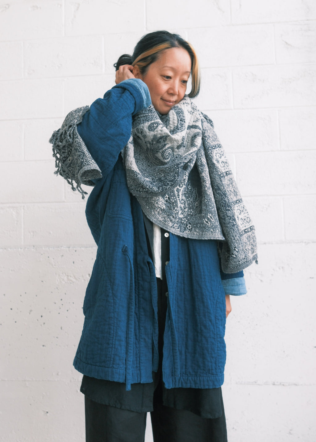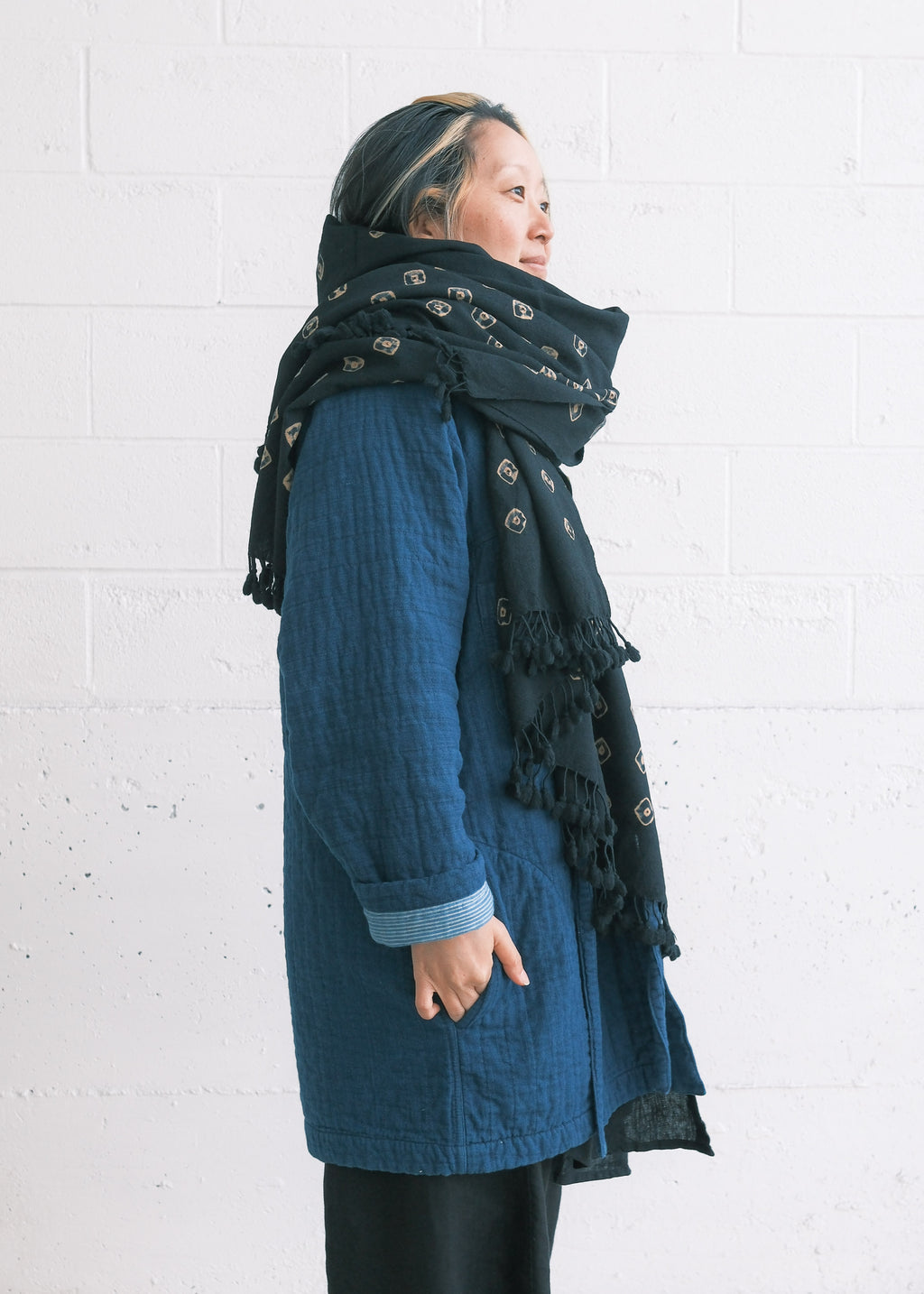 An oversized coat that looks great on all genders. Rolling the sleeves changes the fit and reveals a gorgeous contrasting cloth. Made of cozy quilted fabric - cotton flannel in between two layers of handwoven cotton cloth. With two chest pockets, two side pockets and tie closure.