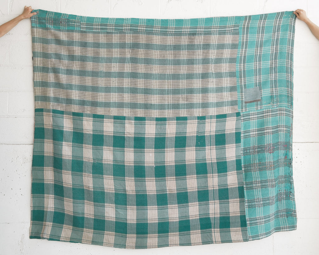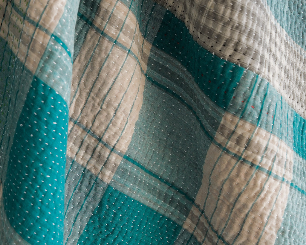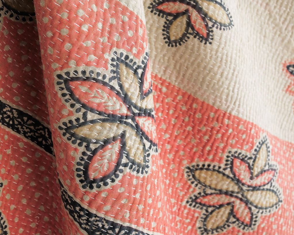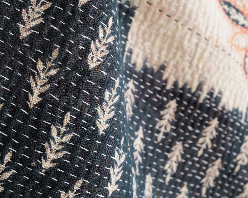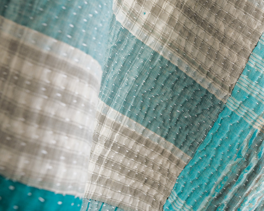 Kantha quilts are made for household use in rural parts of Bengal and Bangladesh. Favourite prints, saris, and beloved lengths of cloth are stitched together with plain and coloured threads. Every quilter has her own individual style. These quilts are used as bedcovers, blankets, tablecloths, picnic blankets, car blankets, couch blankets ... there is no limit to the utility of these textiles. We love the history and stories each one holds.