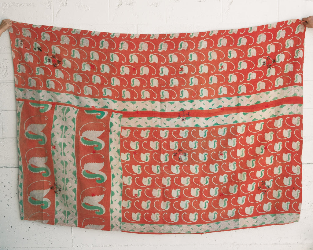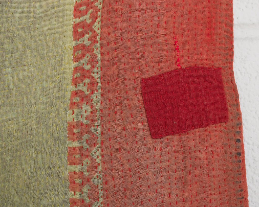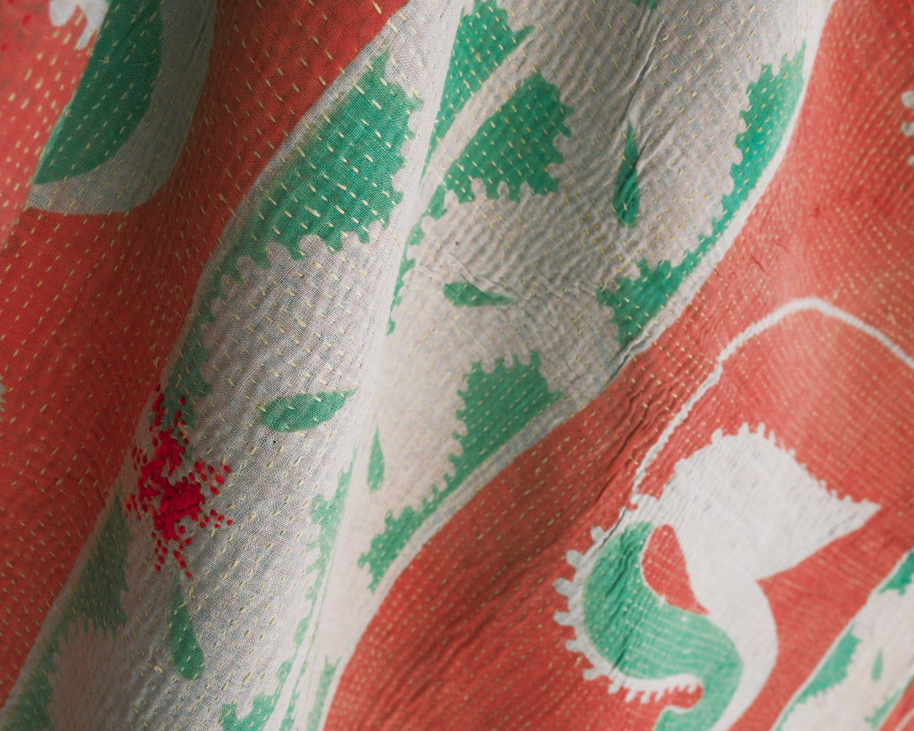 Kantha quilts are made for household use in rural parts of Bengal and Bangladesh. Favourite prints, saris, and beloved lengths of cloth are stitched together with plain and coloured threads. Every quilter has her own individual style. These quilts are used as bedcovers, blankets, tablecloths, picnic blankets, car blankets, couch blankets ... there is no limit to the utility of these textiles. We love the history and stories each one holds.