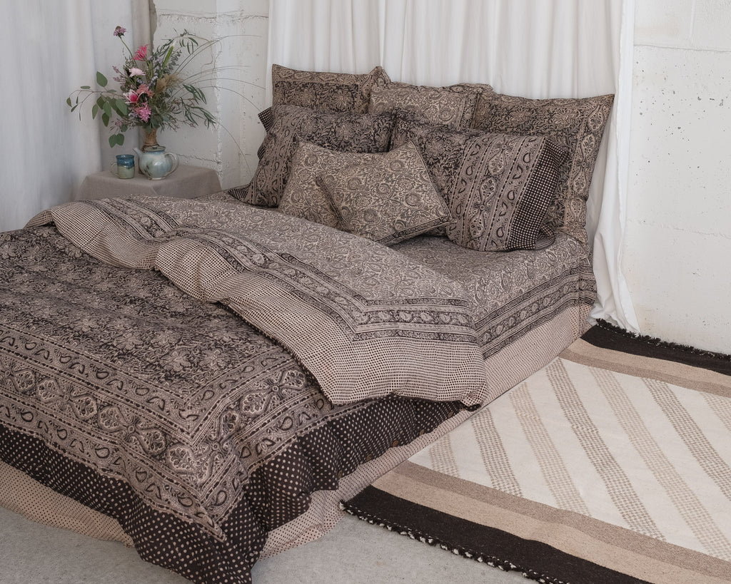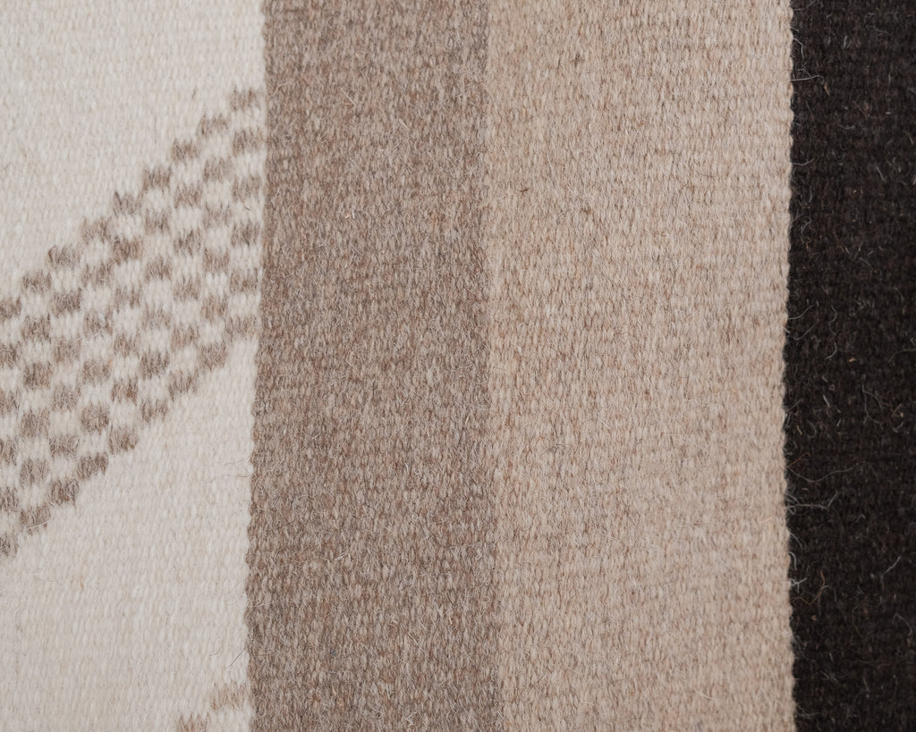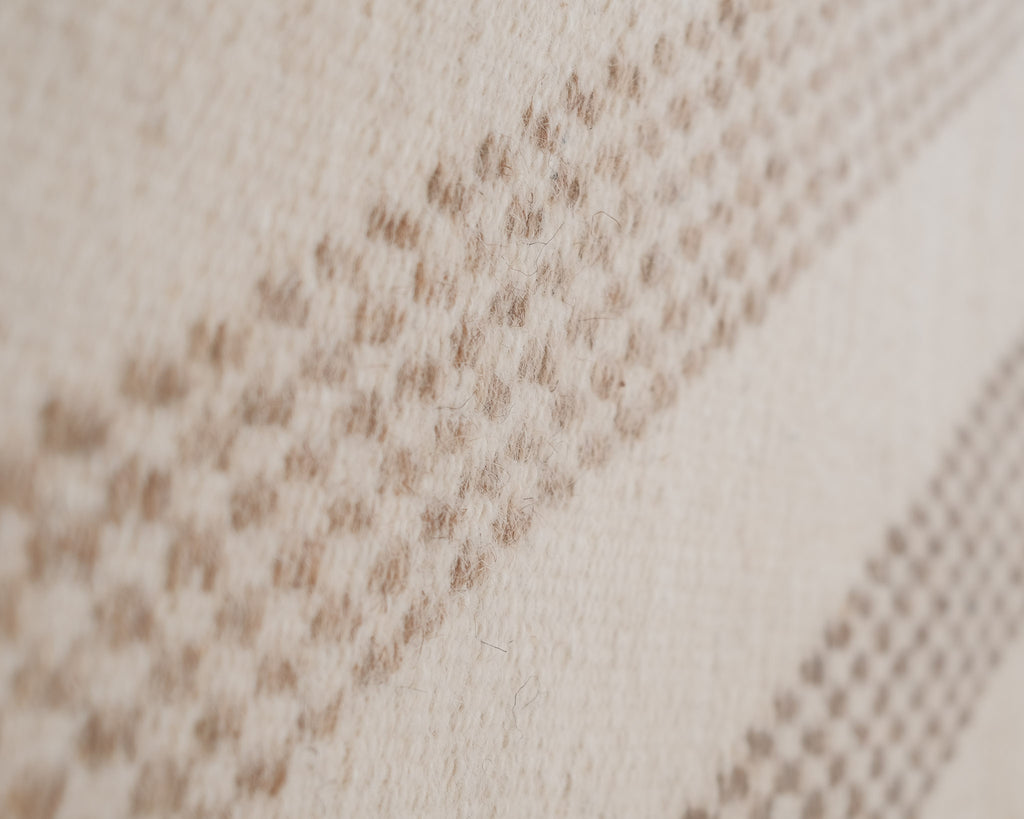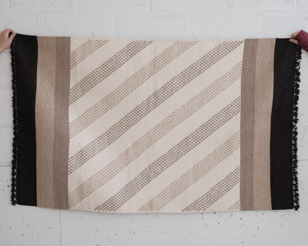 A handwoven wool carpet with a sturdy cotton warp made by village artisans in Rajasthan, India. The natural fibres of the local sheep in the desert regions of Rajasthan makes these flat-weave rugs long lasting and durable.