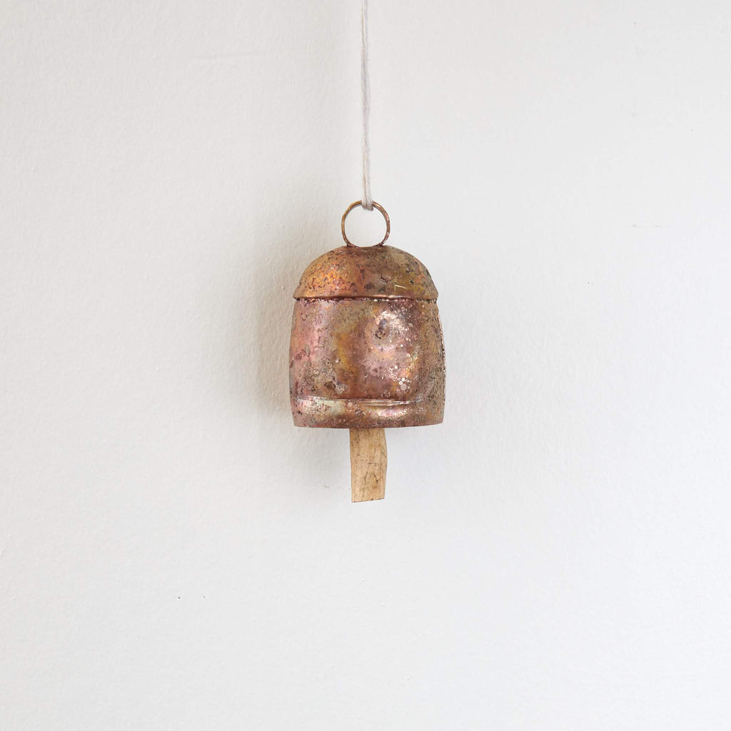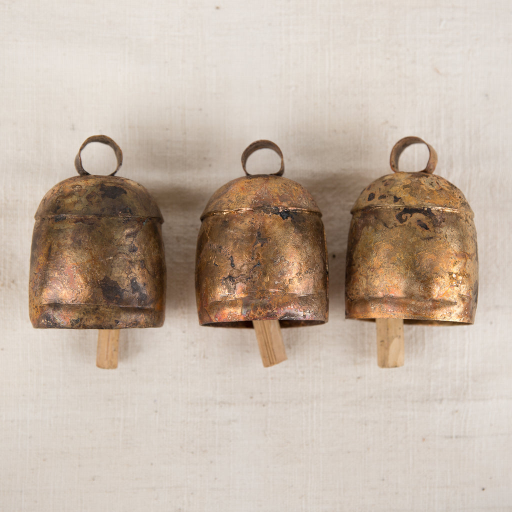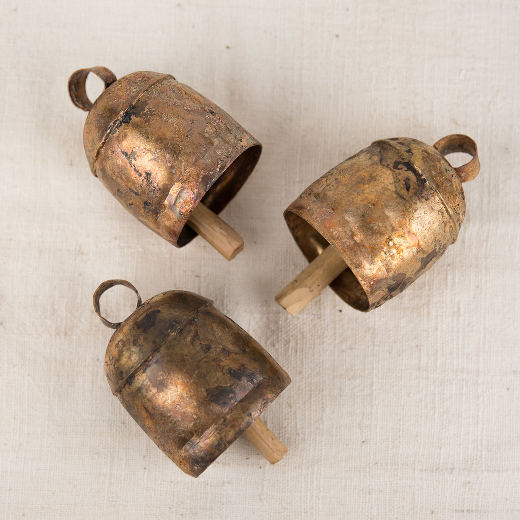Hand-forged bell made by the artisan bell makers of the Kachchh desert. Steel, finished with a brass-copper patina.