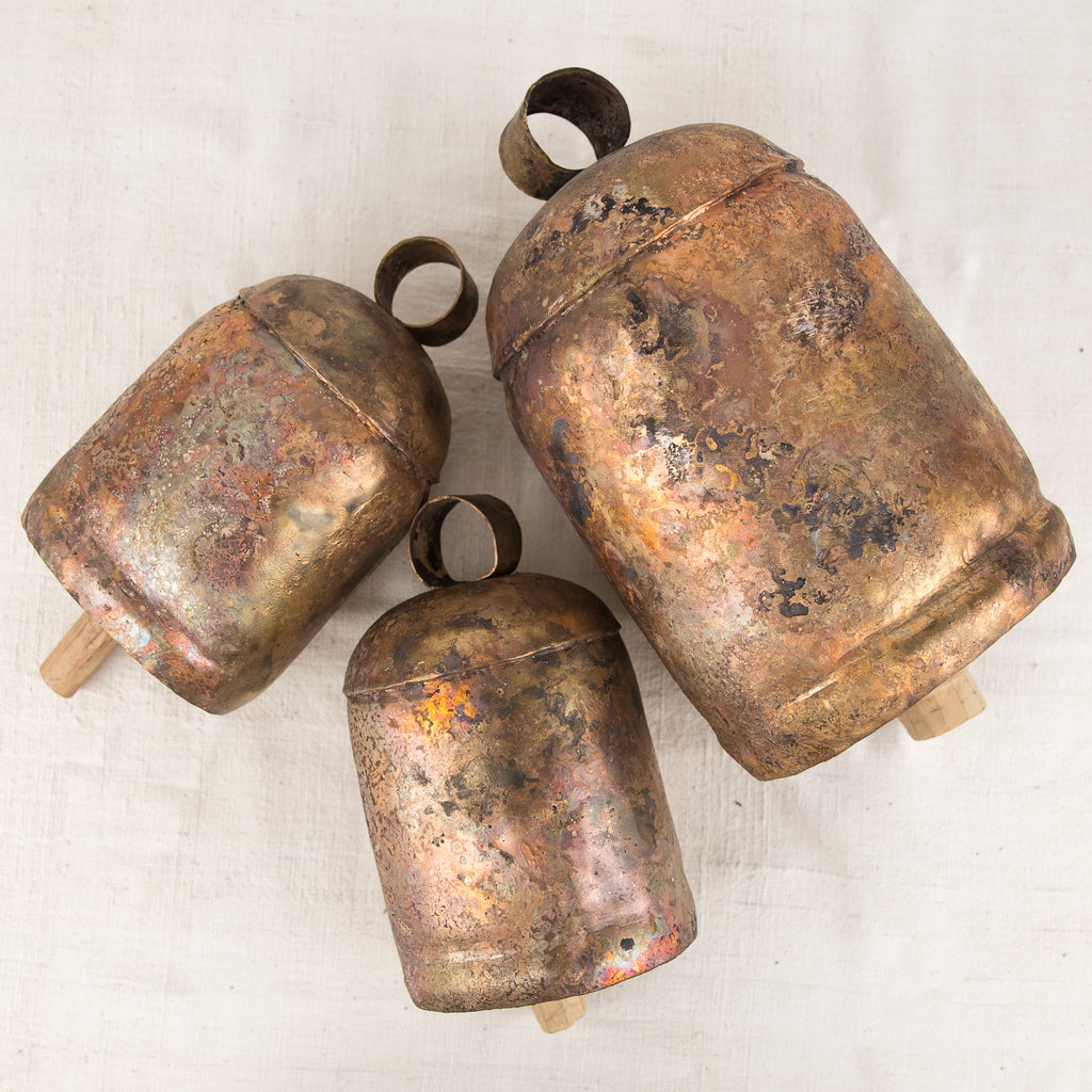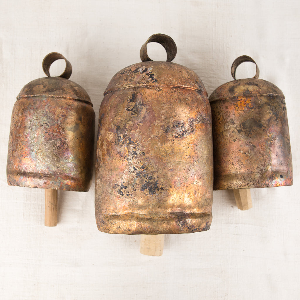 Hand-forged bell made by the artisan bell makers of the Kachchh desert. Steel, finished with a brass-copper patina.
