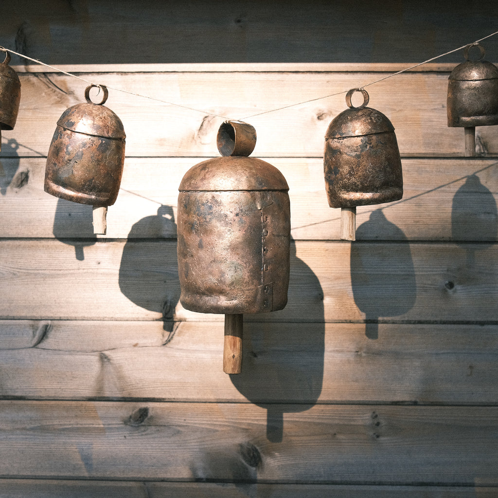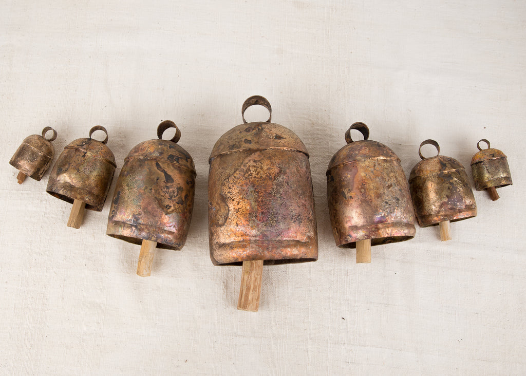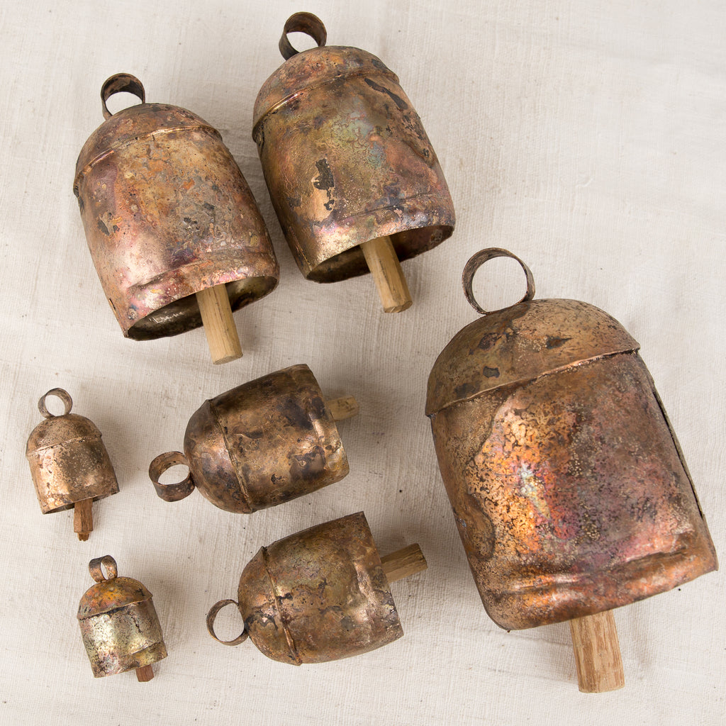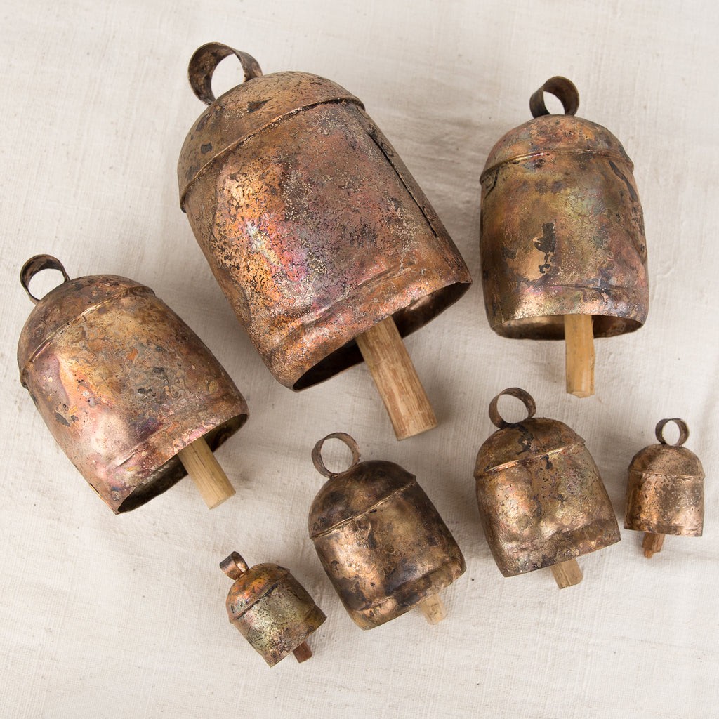 Hand-forged bell made by the artisan bell makers of the Kachchh desert. Steel, finished with a brass-copper patina.