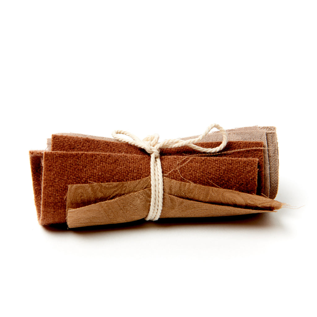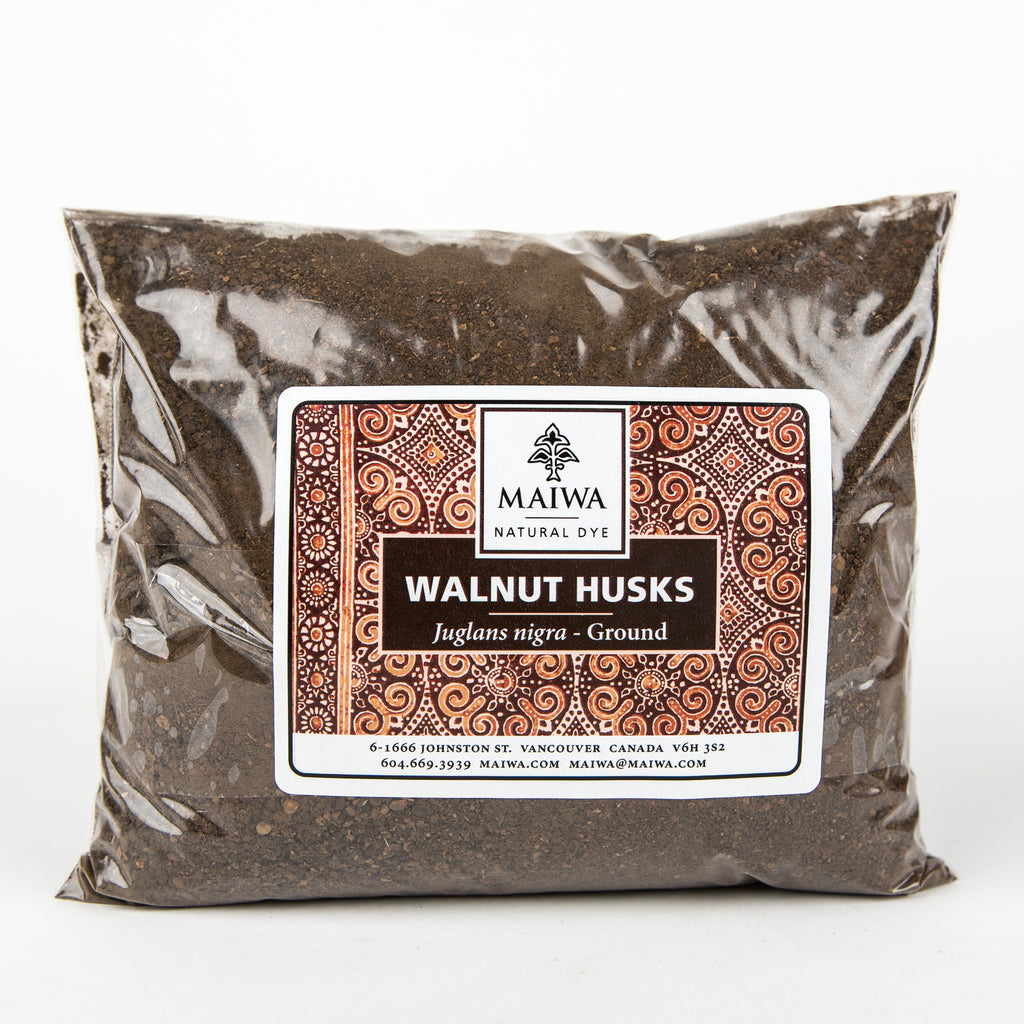 Walnut – (Eastern Black Walnut) Juglans nigra. This dyestuff is obtained from the bark of the tree and also from the green husks of the fruit. Domonique Cardon has called walnuts “great living laboratories of dye production.” Walnut is a substantive dye and can be used without a mordant. It can be used alone to produce warm deep taupes or to give extra depth in combination with other dyes. Historically it has been used with madder (both rubia cordifolia and rubia tinctoria) to produce mahogonies. Walnut responds well to overdyeing with iron producing rich grey/browns. Ground walnut is used at 30-50% WOF.