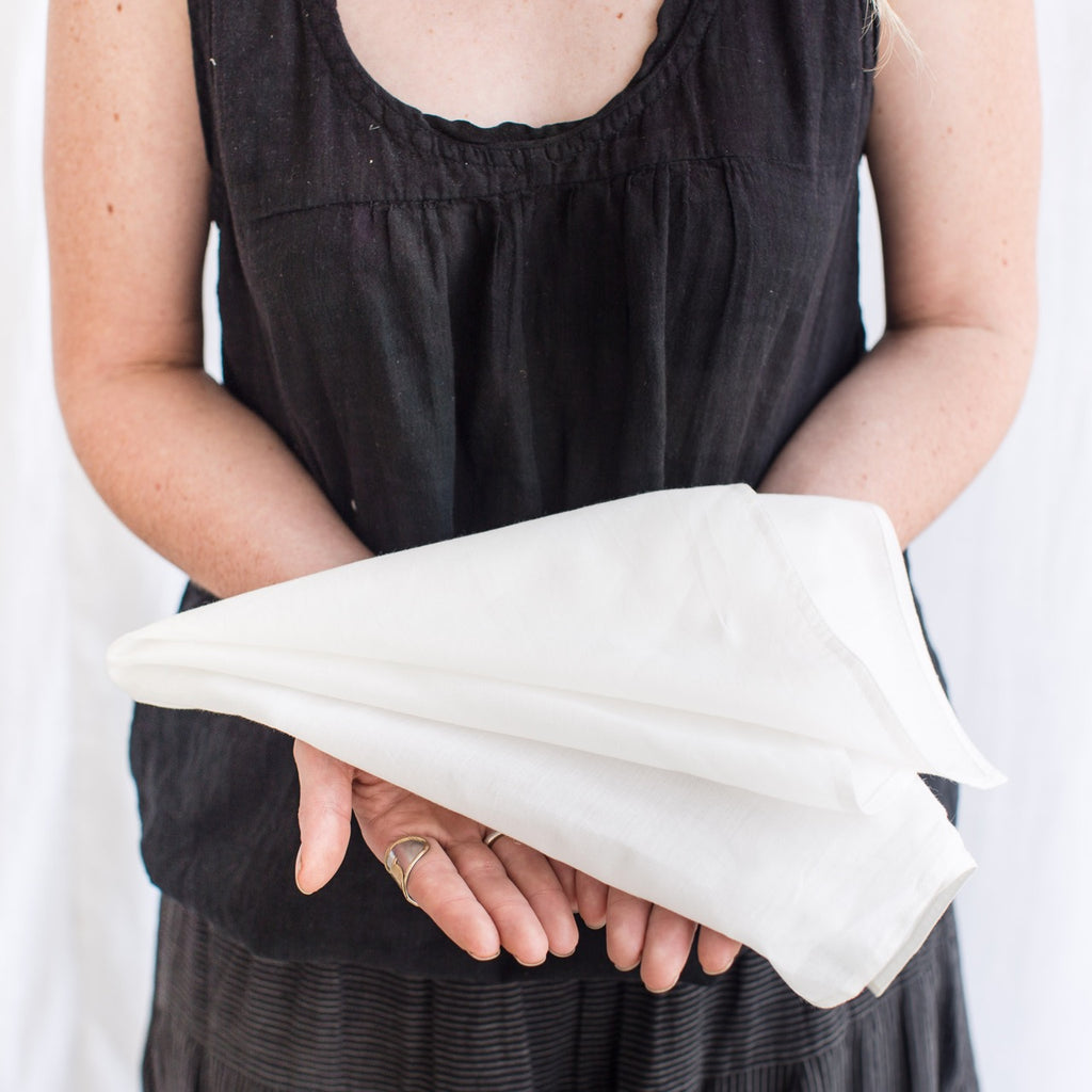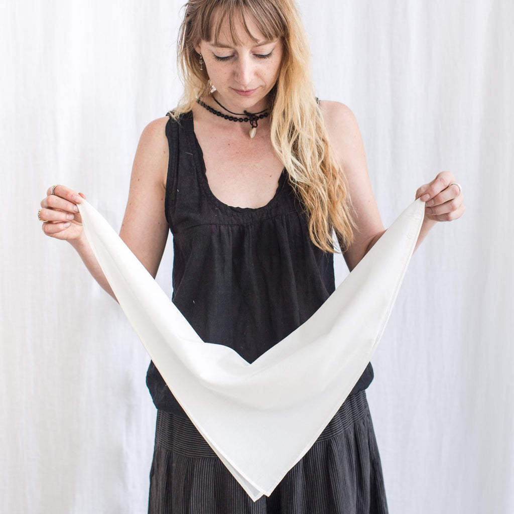A wholesale bundle of 12 organic lightweight cotton bandanas. Great for dyeing and surface design projects. The hem is sewn with cotton thread making it optimal for indigo & natural dyes.