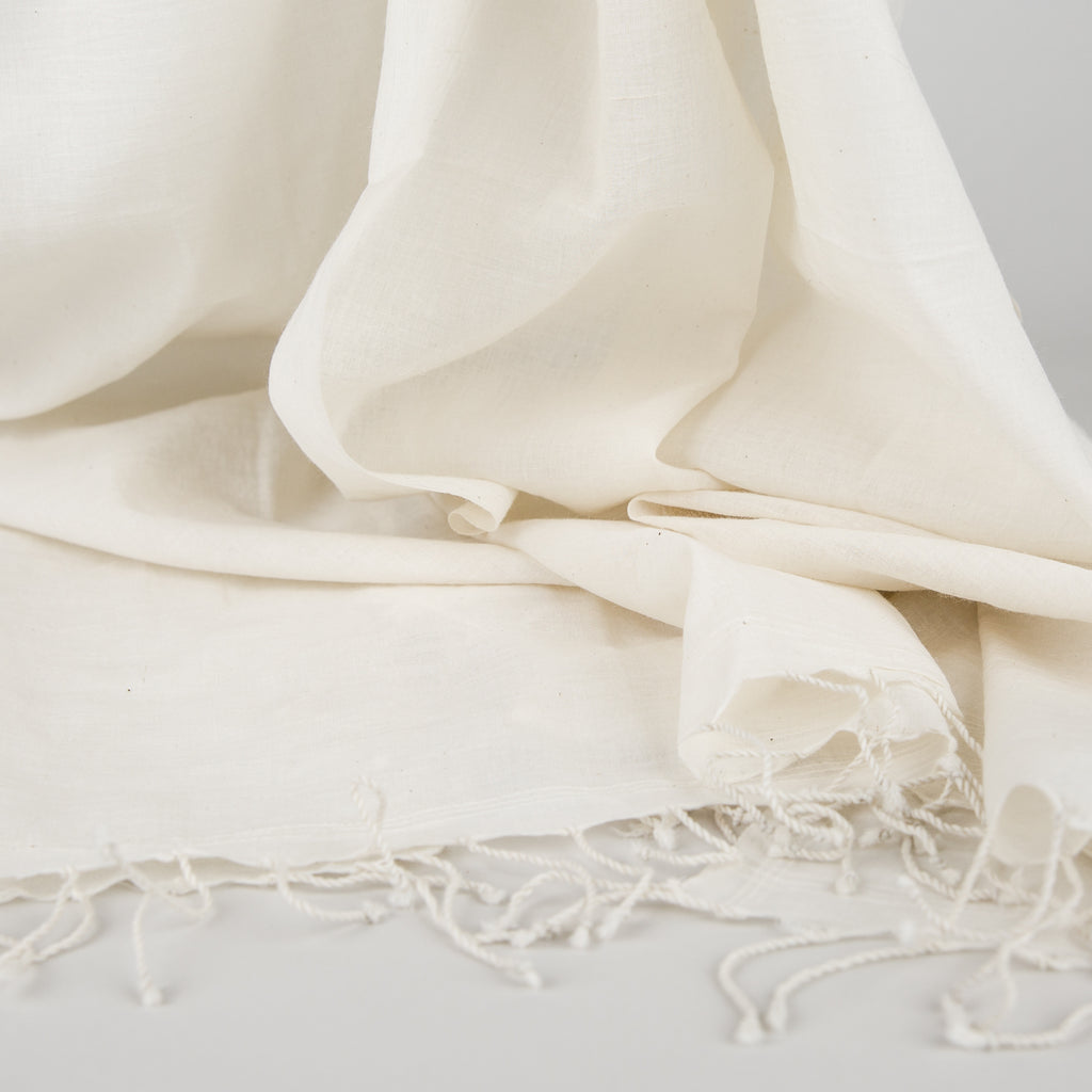 These fine cotton scarves are handspun and handwoven in India in partnership with Maiwa. They have a tasseled edge, lightweight with a lovely drape, and are perfect for a creative project such as dyeing, shibori, and itajime.