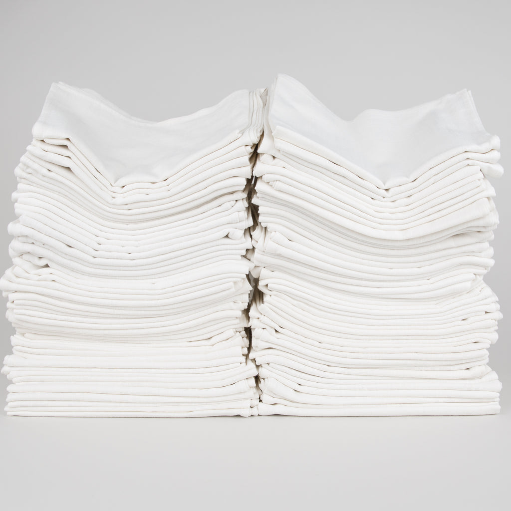 A set of 100 textured, heavyweight organic plain-weave slub cotton tea towels at a wholesale price. Great for dyeing and surface design projects. Featuring a loop to hang the towel. All sewing is done with cotton thread, making it great for indigo and other natural dyes.