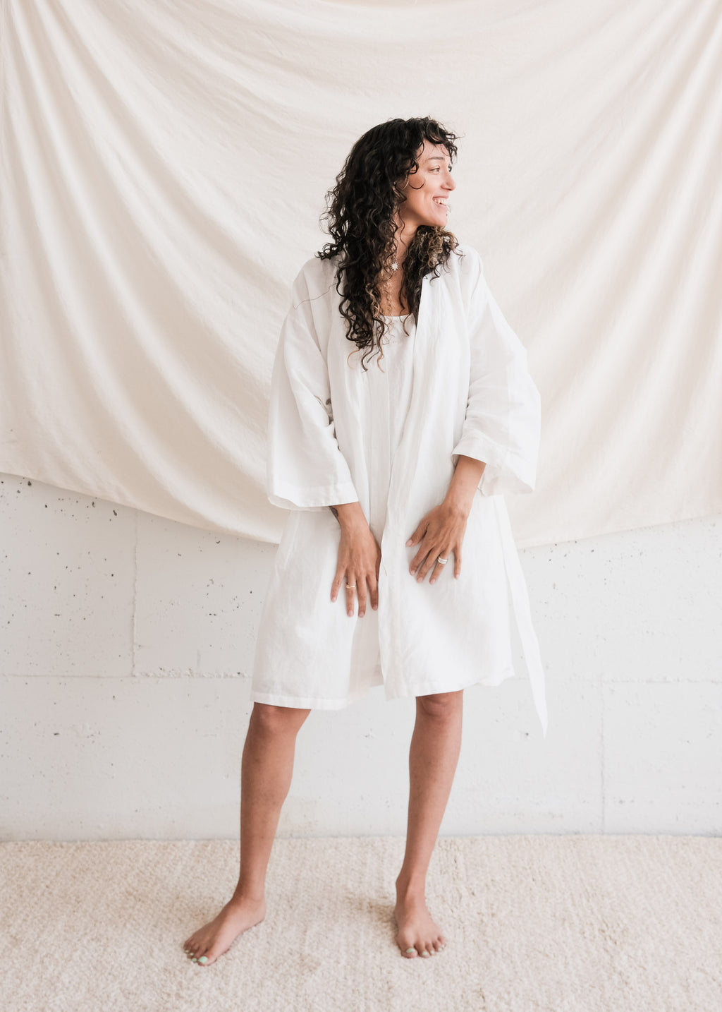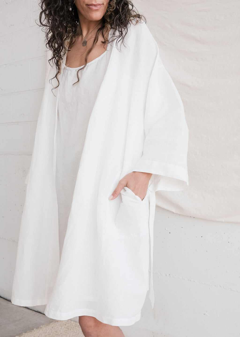A gorgeous handwoven textured cotton linen robe which sits at mid-length. Inside tie closure with belt and side pockets. Wrap yourself up in beautifully woven cloth. We love this garment as a relaxed layer for day wear - we just take the belt out!