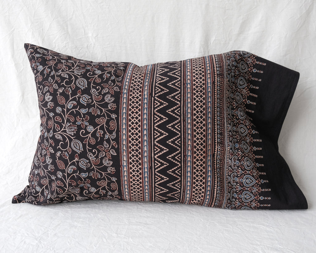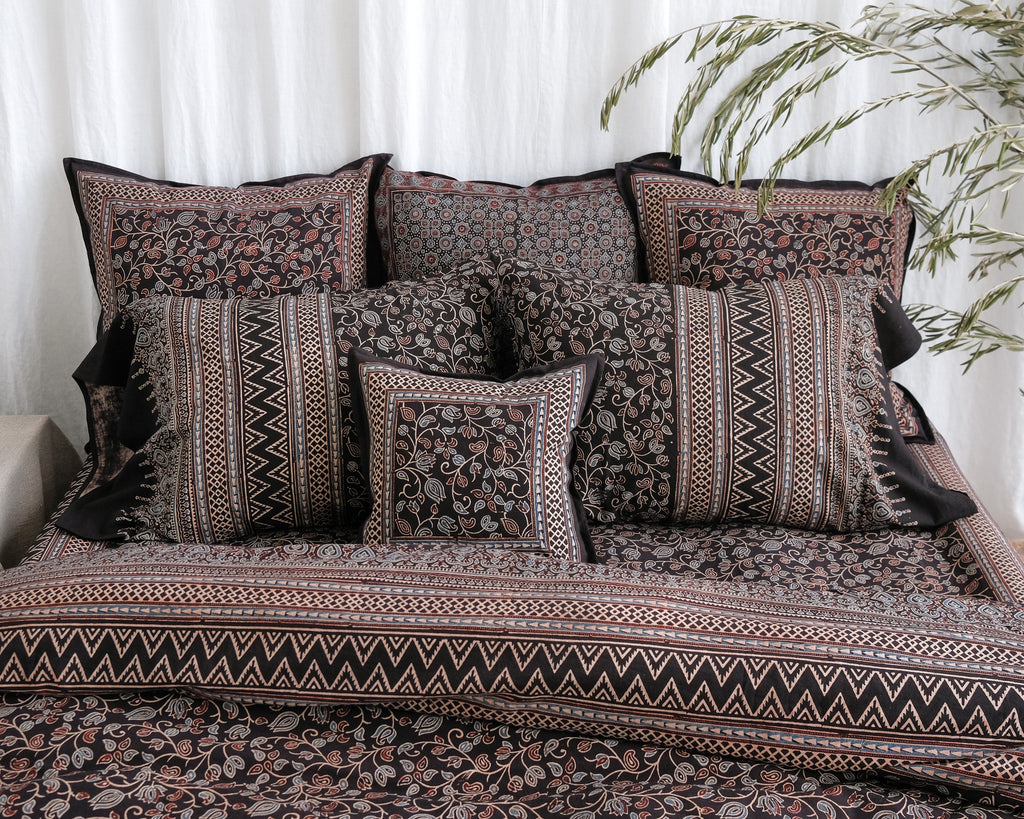 Ajrakh is a traditional style of block printing which uses hand-carved wooden blocks to print natural dyes on organic cotton. These Ajrakhs are made by a family that has been block printing for over nine generations - the Khatri family residing in the Kachchh desert of Gujarat, India.
