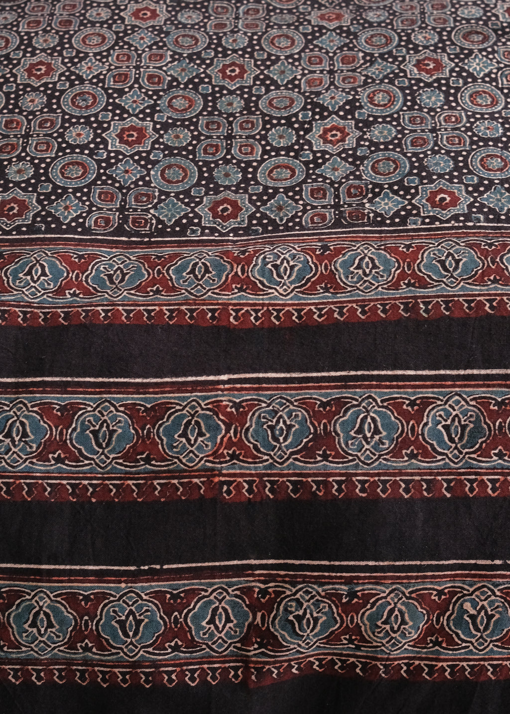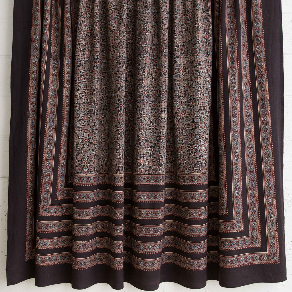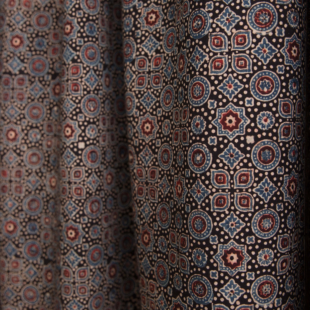 Ajrakh is a traditional style of block printing which uses hand-carved wooden blocks to print natural dyes on organic cotton. These Ajrakhs are made by a family that has been block printing for over nine generations - the Khatri family residing in the Kachchh desert of Gujarat, India.