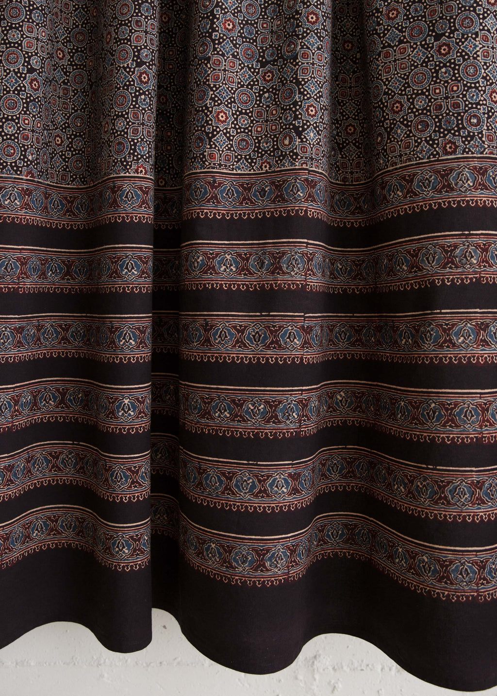 The process of making an Ajrakh is a long one, involving between thirteen and twenty distinct steps. The many processes of scouring, washing, printing, dyeing, and final washing can take up to three weeks to complete. Much of the beauty and depth of Ajrakh cloth comes from the intricacy of the imprint that is left by the artisan’s hand. Slight variations are to be celebrated.