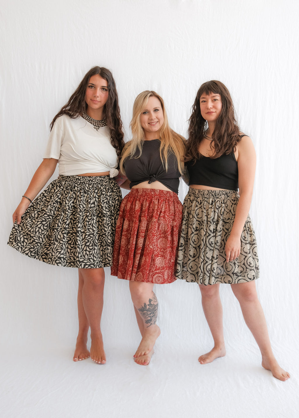 A super cute short skirt with incredible drape and gathered details. Comfortable elastic waist, generous sizing, free flowing and playful. Personalize the look and style however you please. A perfect way to show off beautiful artisanal cloth.