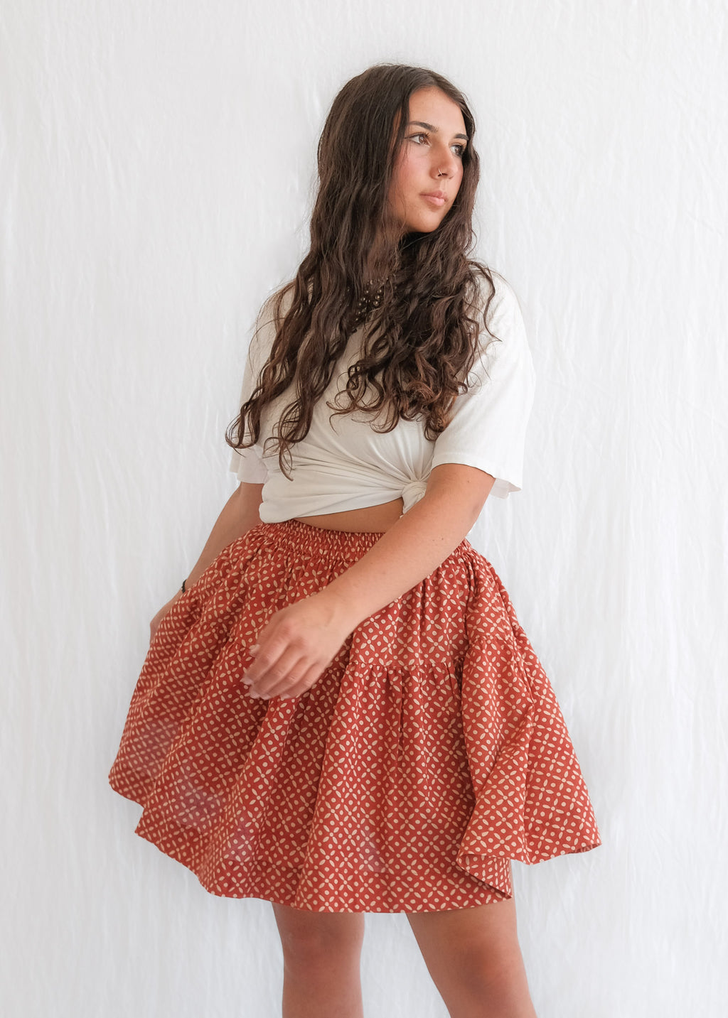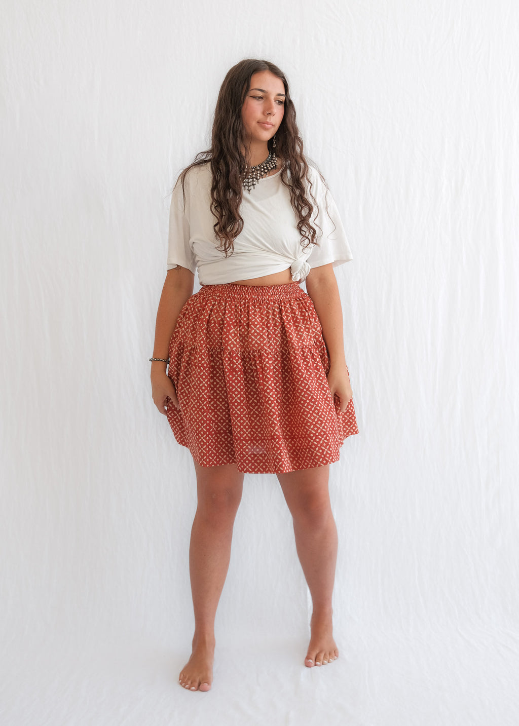 A super cute short skirt with incredible drape and gathered details. Comfortable elastic waist, generous sizing, free flowing and playful. Personalize the look and style however you please. A perfect way to show off beautiful artisanal cloth.