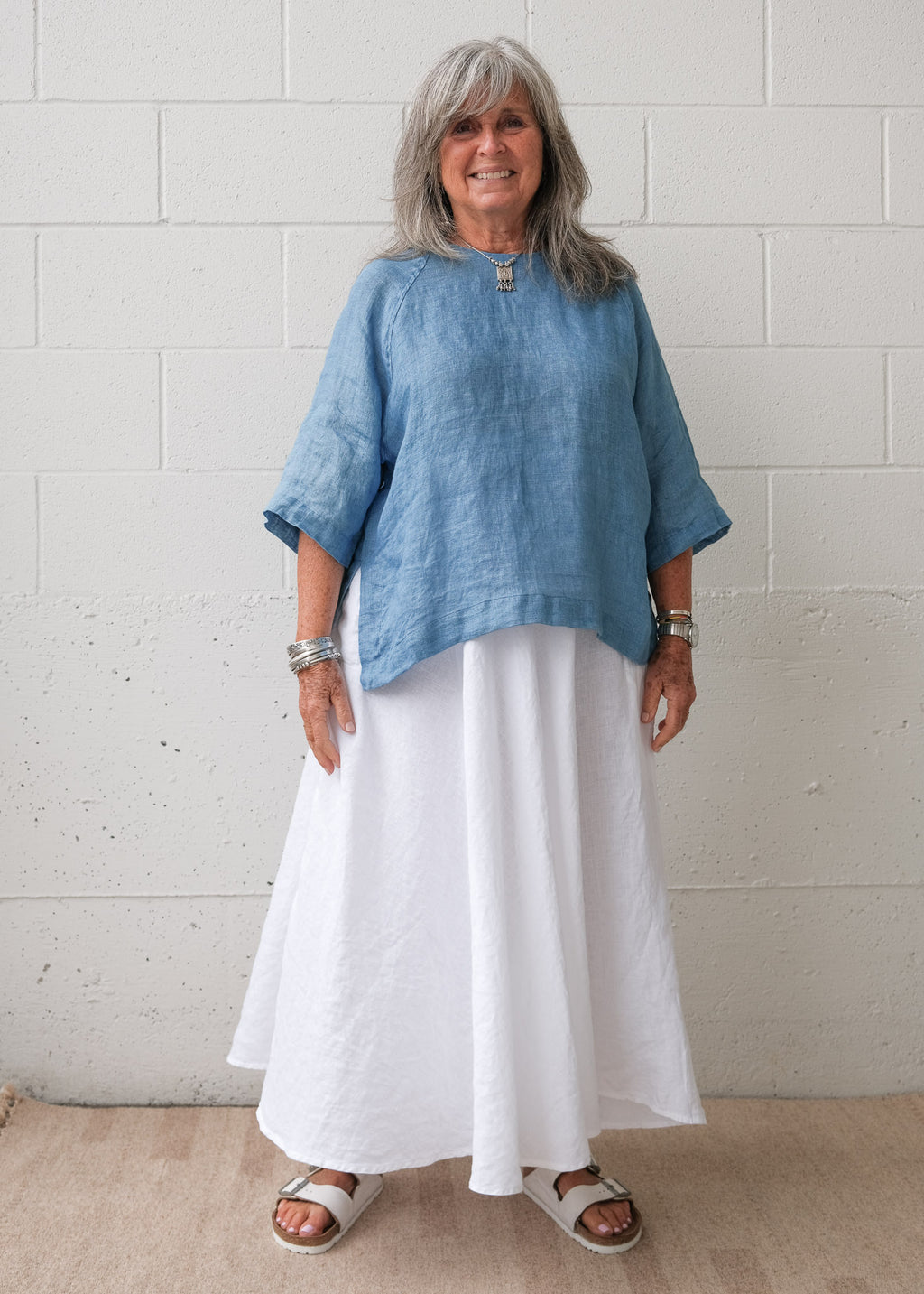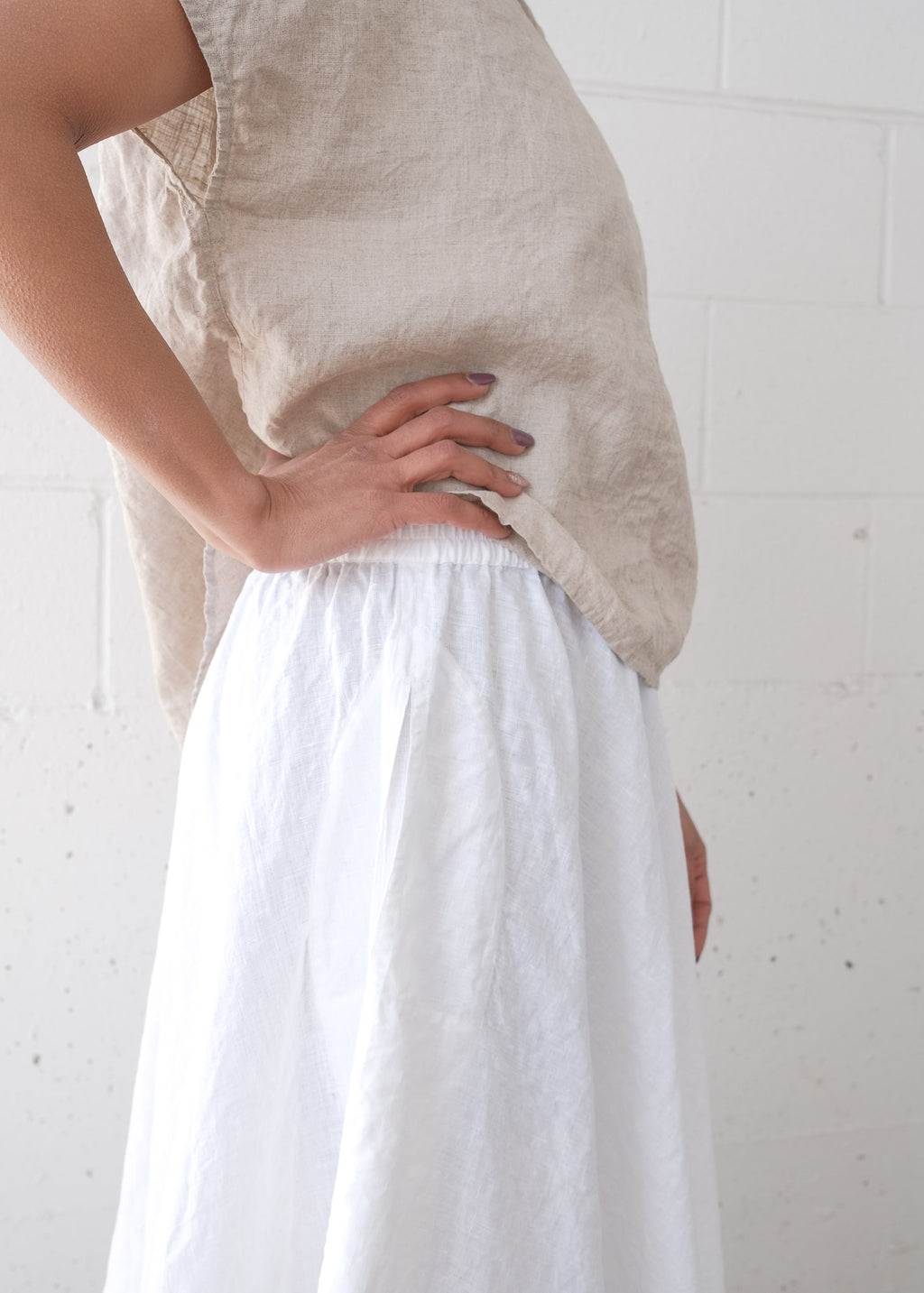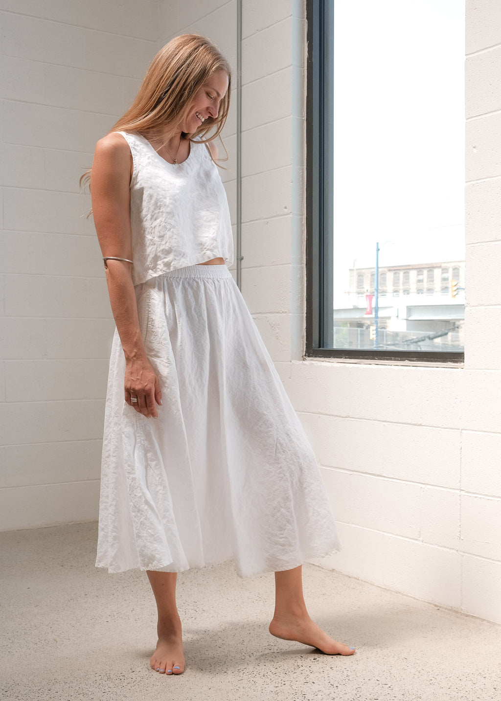 Our favourite everyday skirt which looks great on so many bodies! A bias, midi length skirt with exceptional movement.  Easy elastic waist band and side temple pockets.