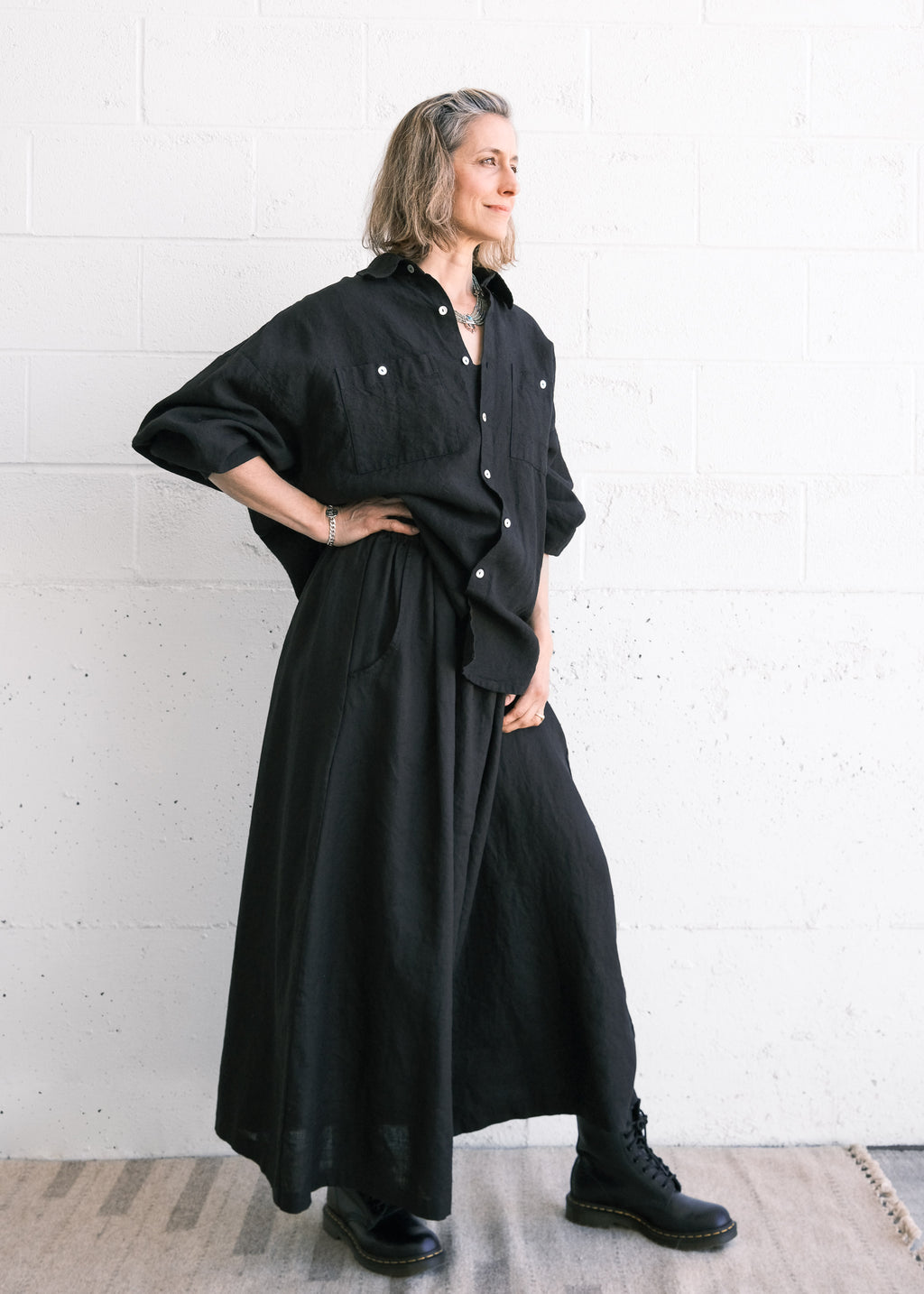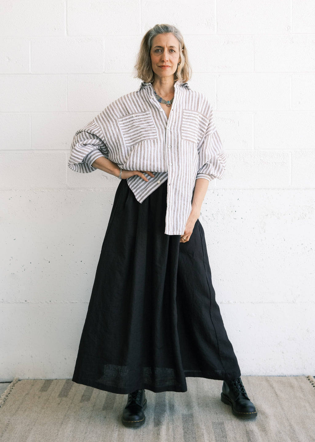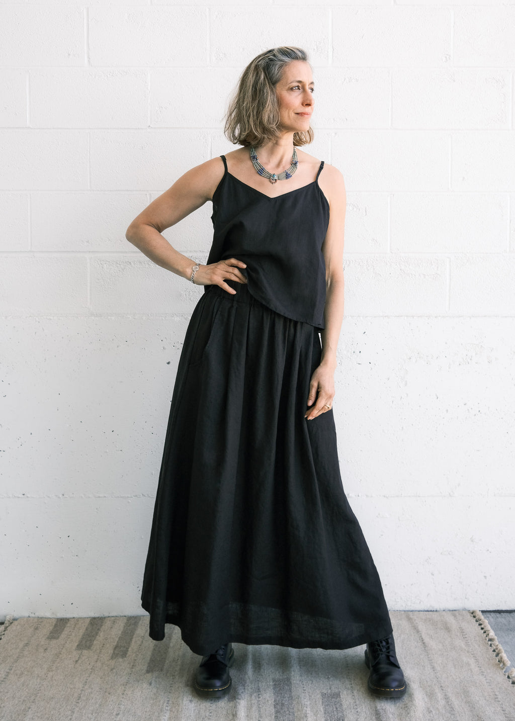 A full length skirt with front pleats and curved side pockets. Designed for all day comfort with a wide elastic waist. The perfect addition to an effortless wardrobe.