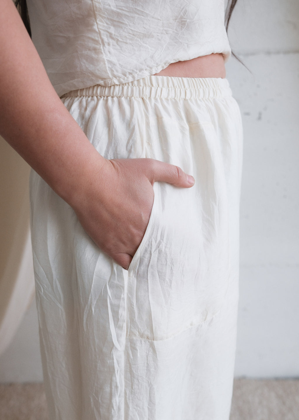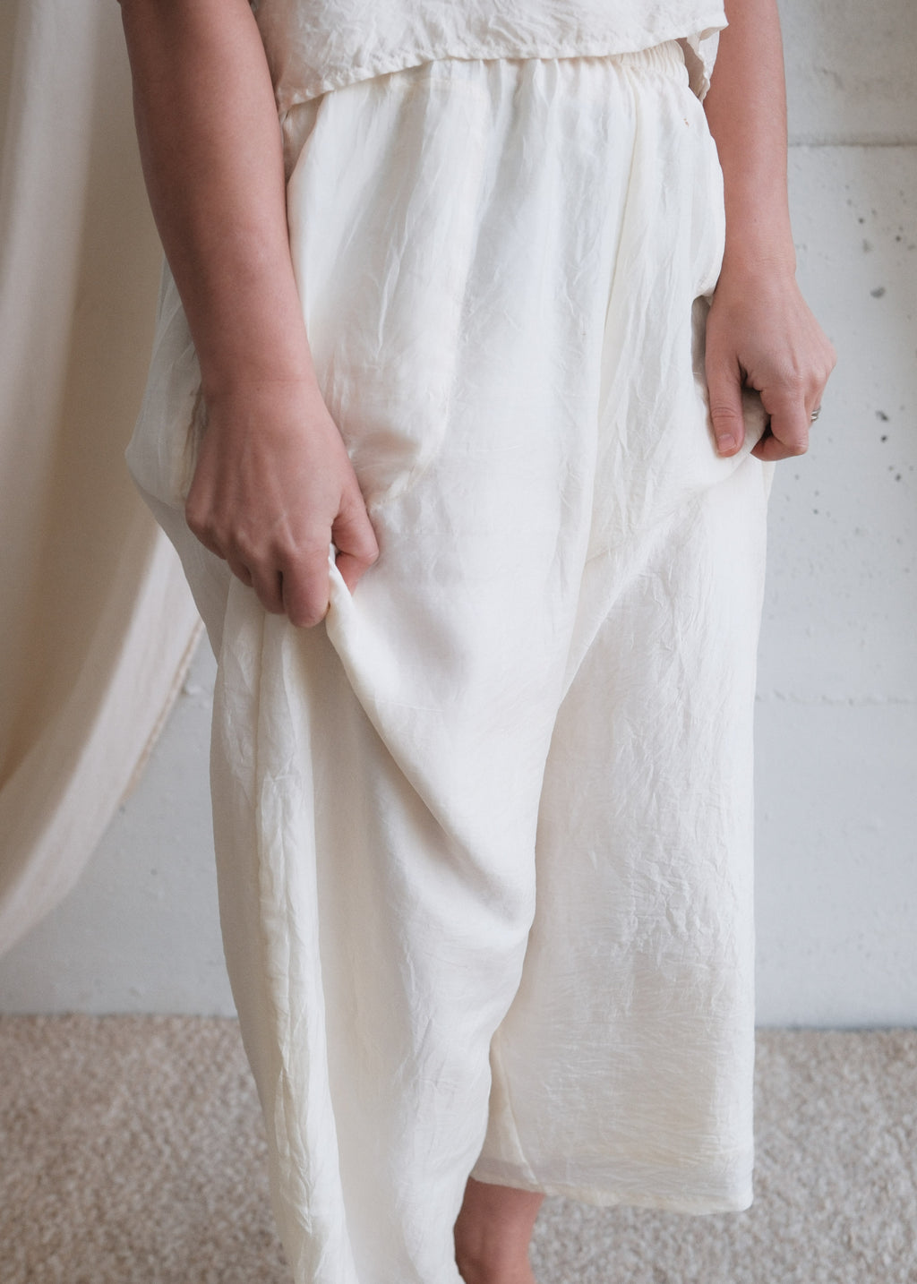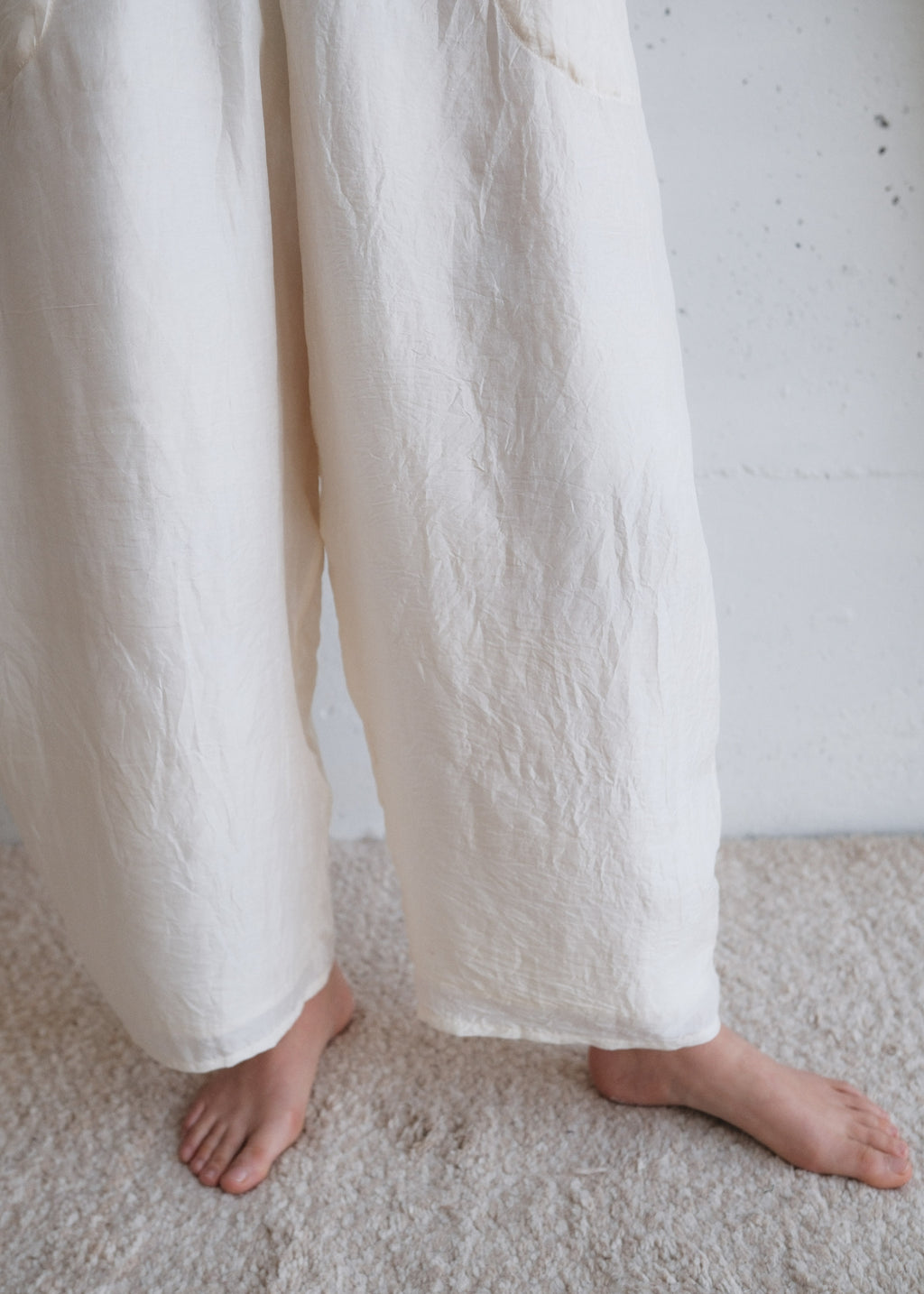 Our Pondicherry Pant has a barrel shape with generous fabric for movement and comfort. Sewn from 2 layers of our classic handwoven silk.