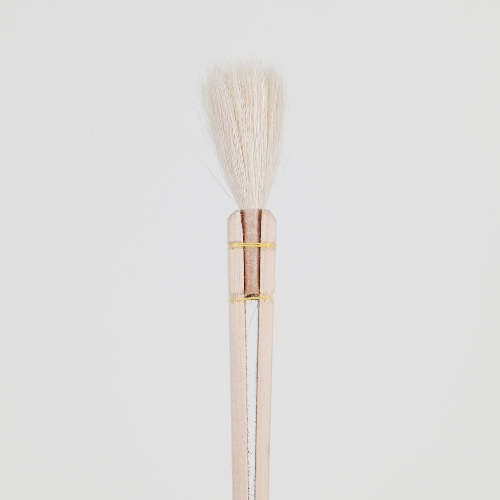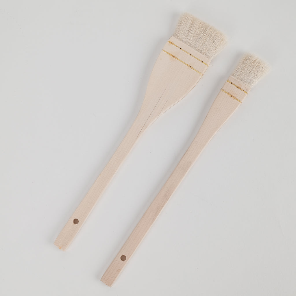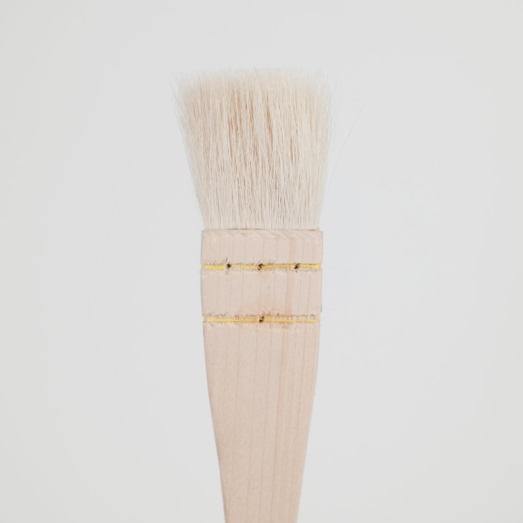 Hake brushes are great for covering large areas.  They are made of soft goat hair and have a broad, flat wooden handle.