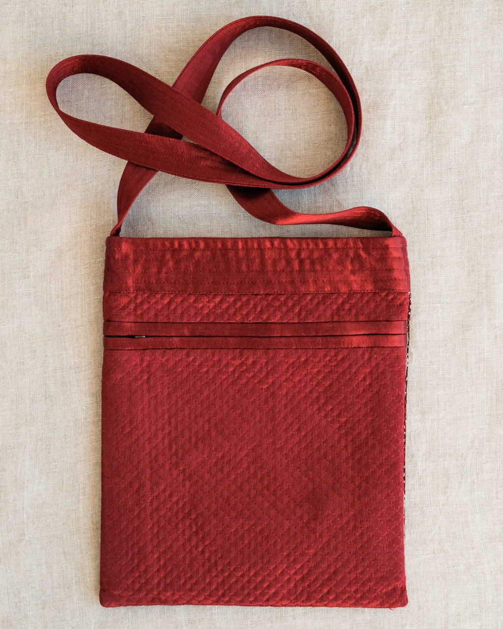 Features: One-sided traditional embroidery on a bag with a zipper closure, zip pocket inside and on the back, with a strap.