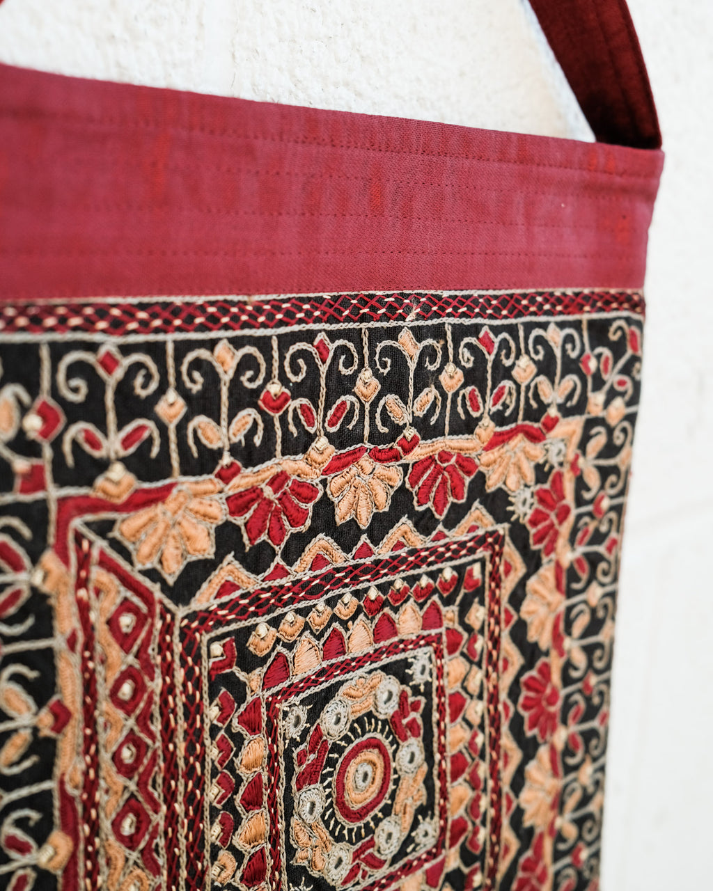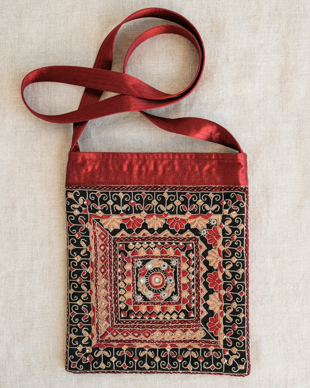A beautiful shoulder bag with delightful Sodha Rajput embroidery. A traditional embroidery using small mirrors and motifs, paired with elegant handwoven mashru, a satin weave created with a cotton weft and silk warp.The perfect size for all your necessities.