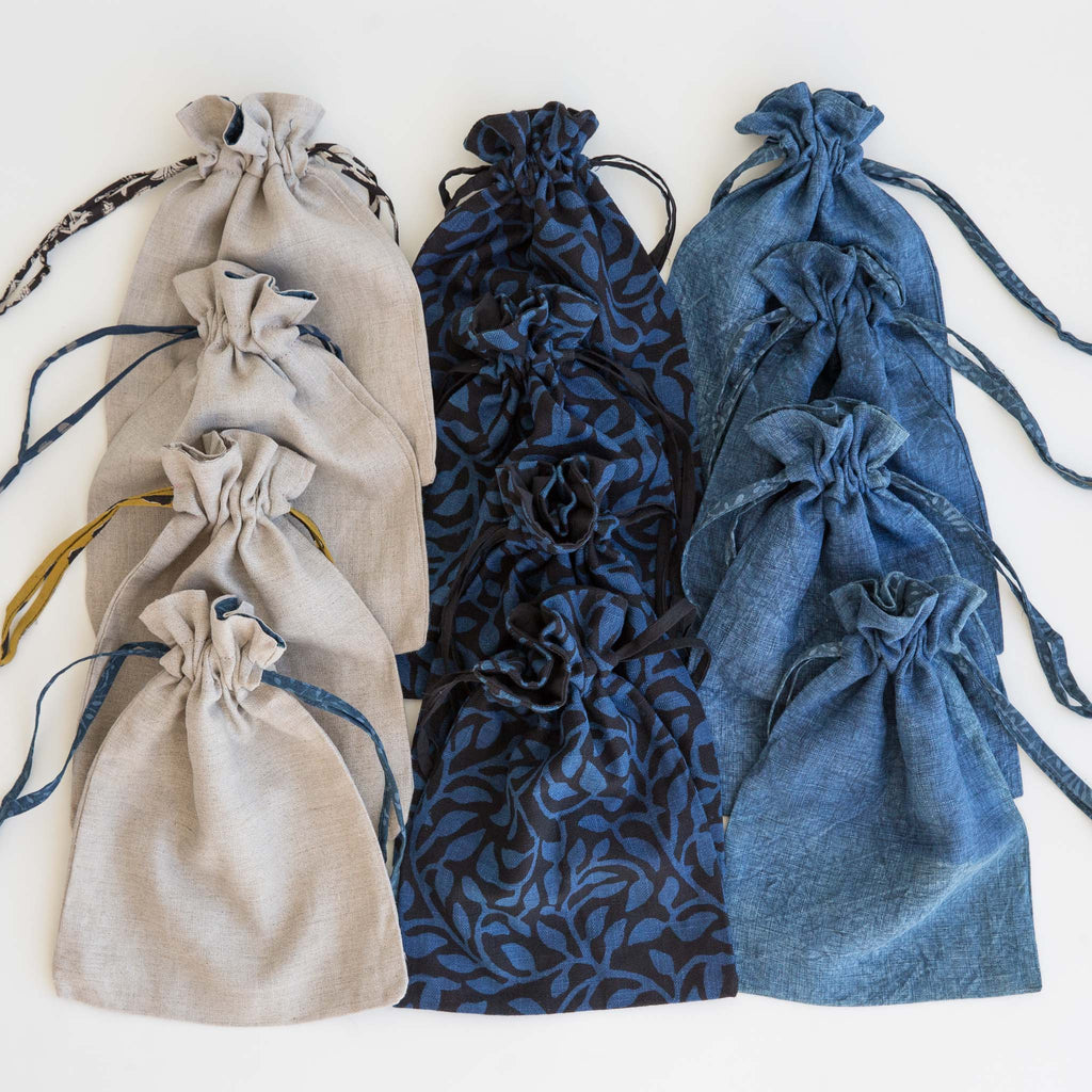 Set of 12 bags at a discount. These naturally dyed drawstring bags are made with a variety of Maiwa's beautiful fabrics. They are great for carrying your essentials and perfect for gift giving.
