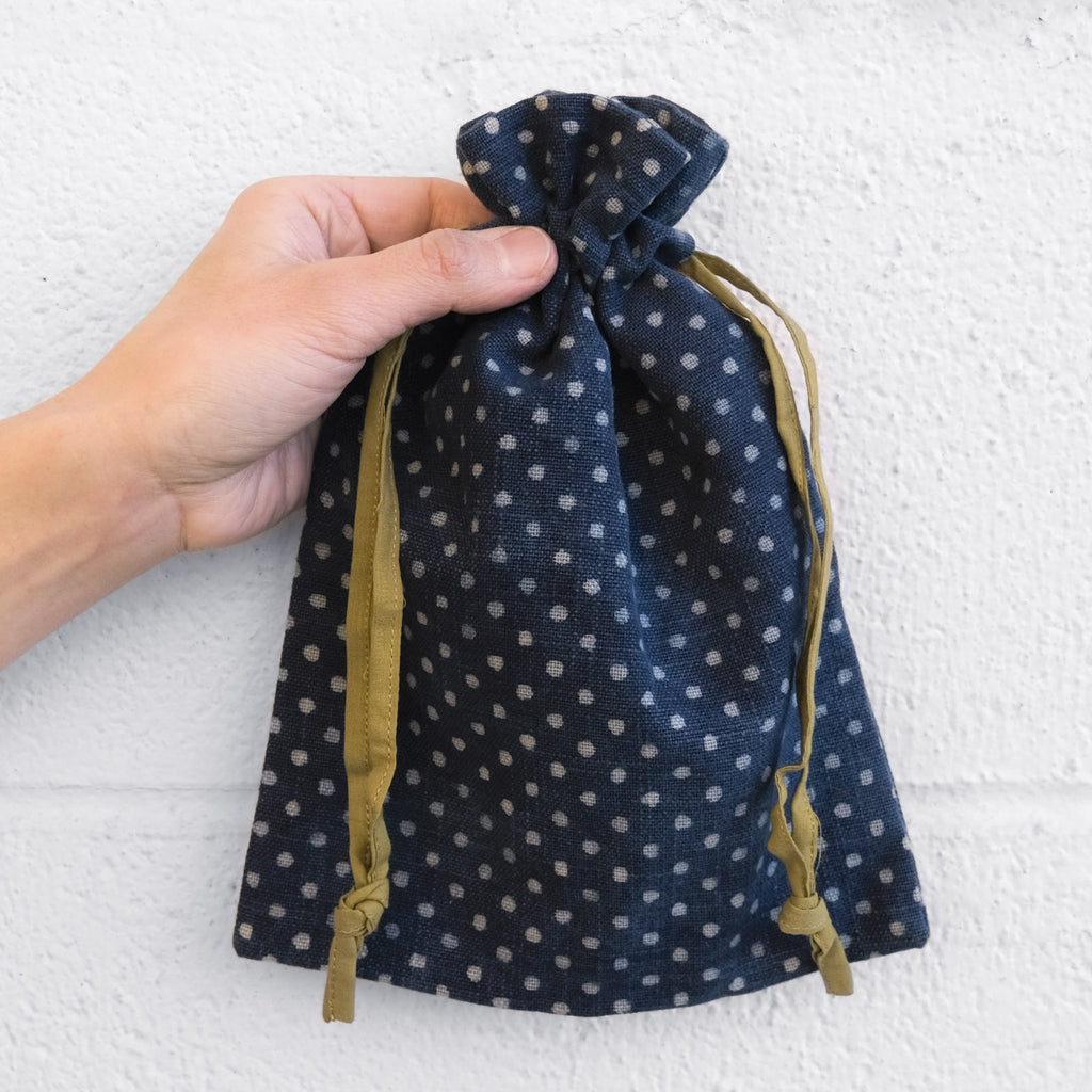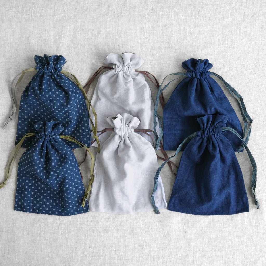 Set of 6 bags at a discount. These naturally dyed drawstring bags are made with a variety of Maiwa's beautiful fabrics. They are great for carrying your essentials and perfect for gift giving.
